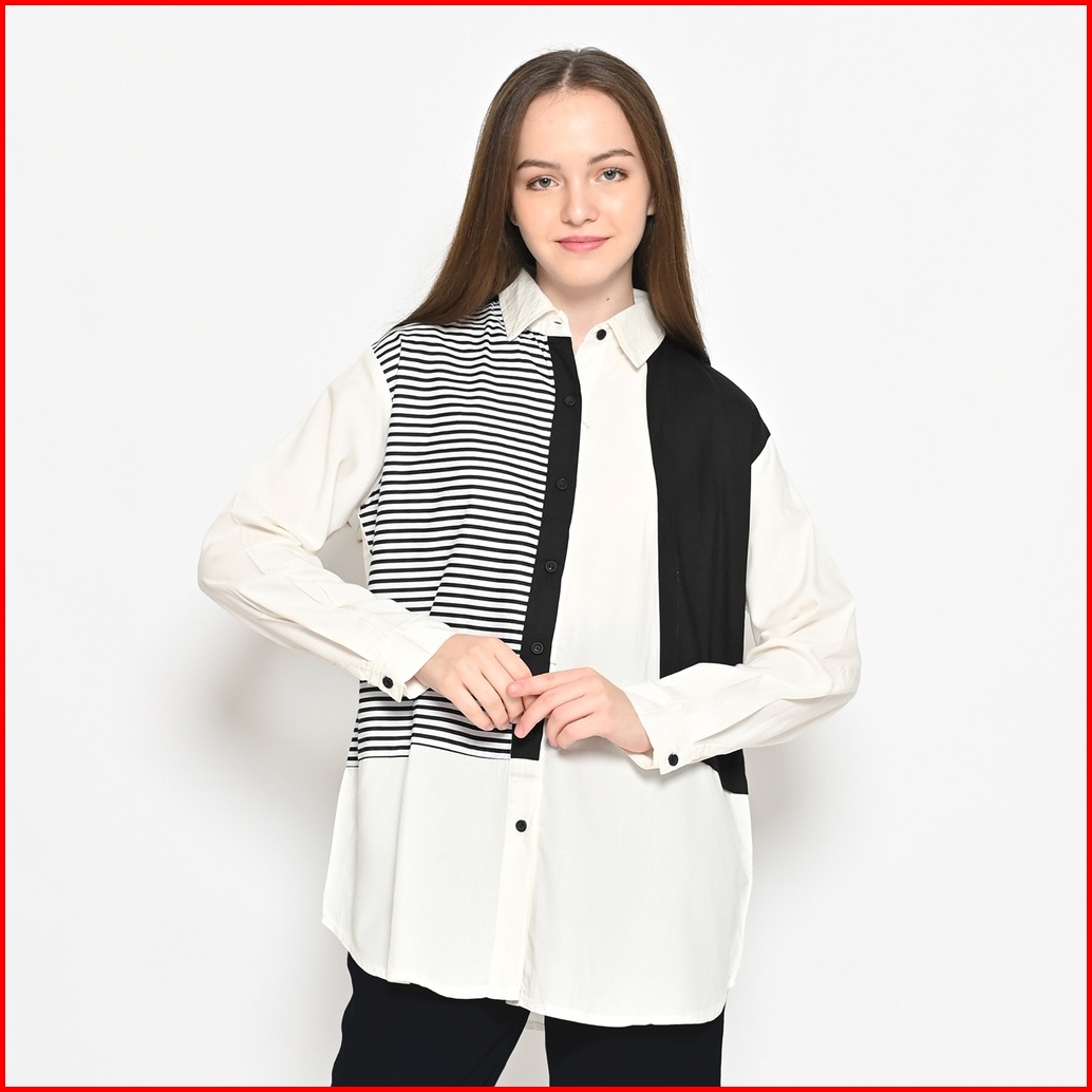 Queentin Kemeja Casual Wanita 0517 Katun Primacool Polos Kombinasi Stripe Premium Lengan Panjang
