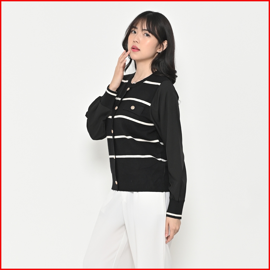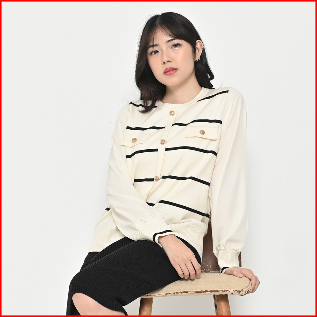 Queentin Sweater Wanita Rajut 7347 Viscose Polyamide Knit Stripe Kombinasi Sifon Lengan Panjang