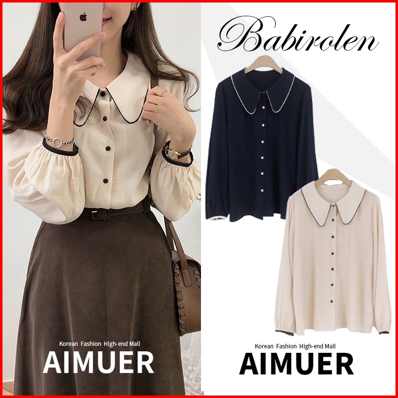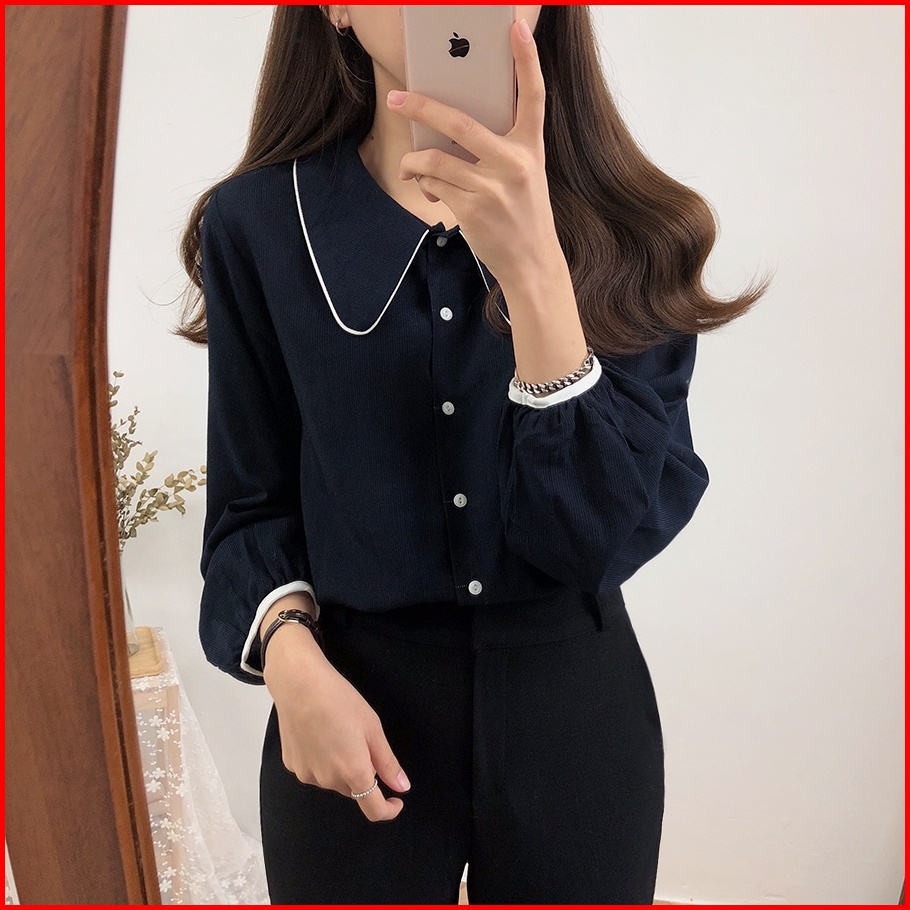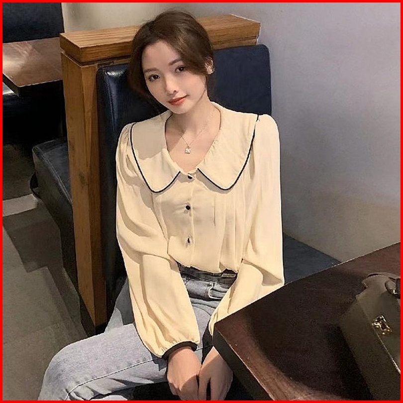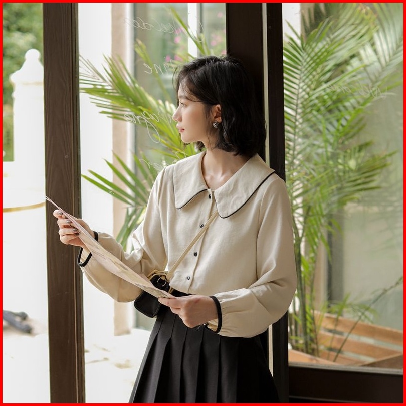 Newlan Xf011 Atasan Wanita Aline Button Blouse Kemeja Style Prancis Katun Cron Kerah Polo