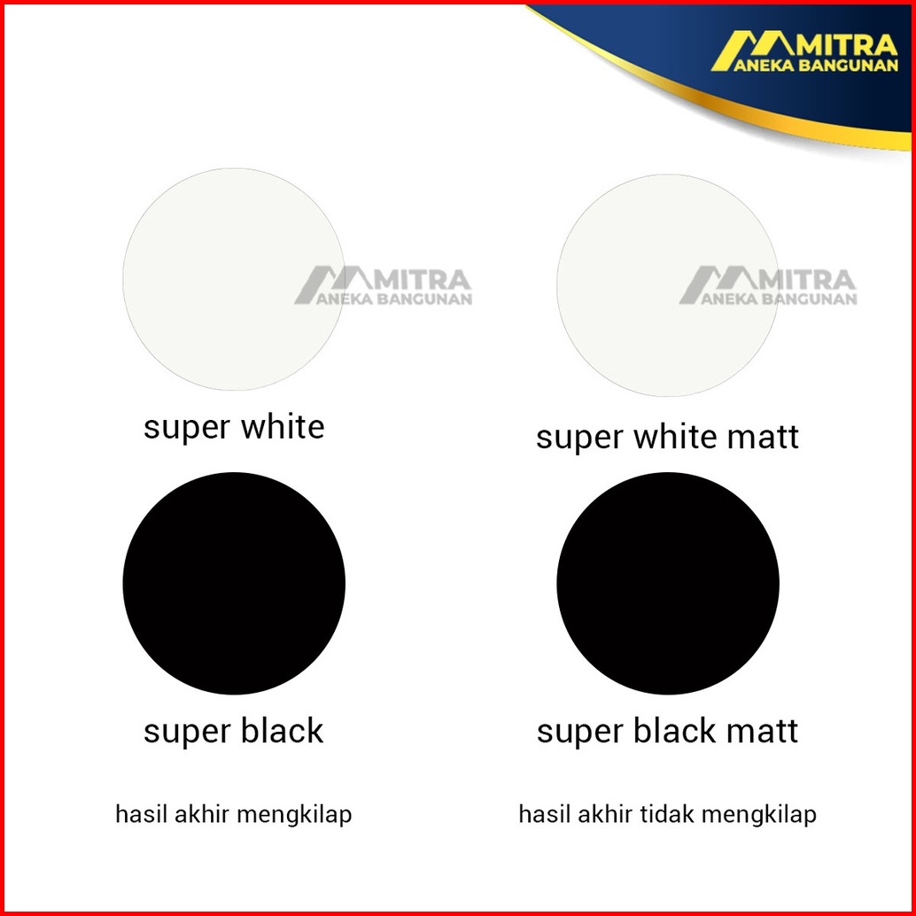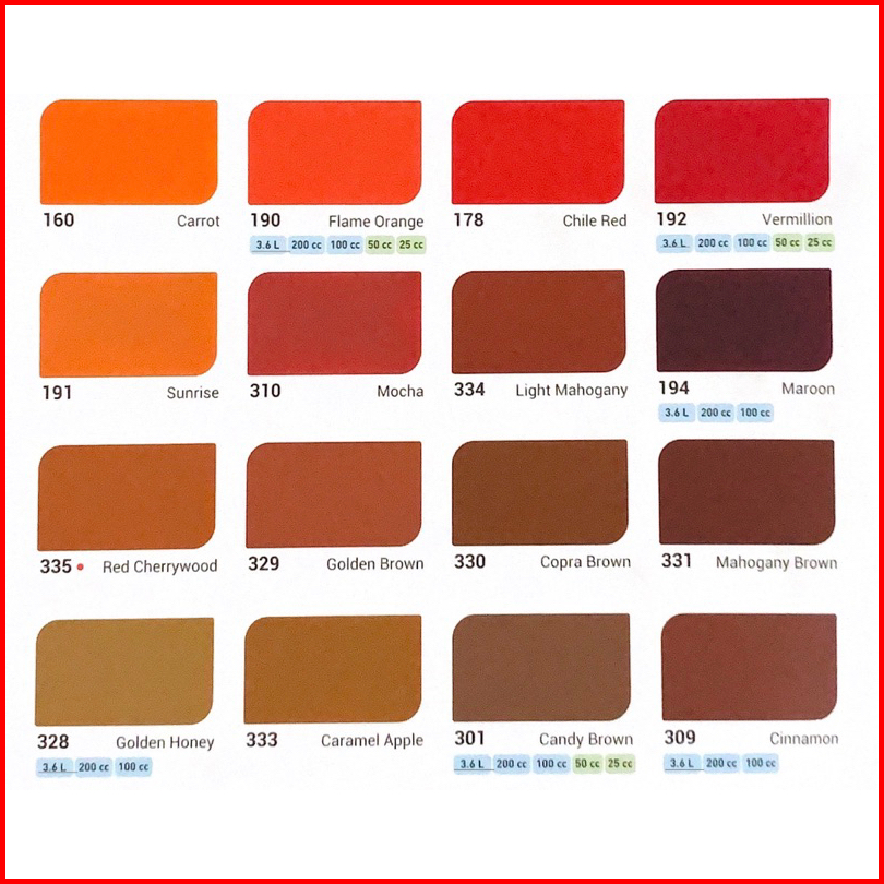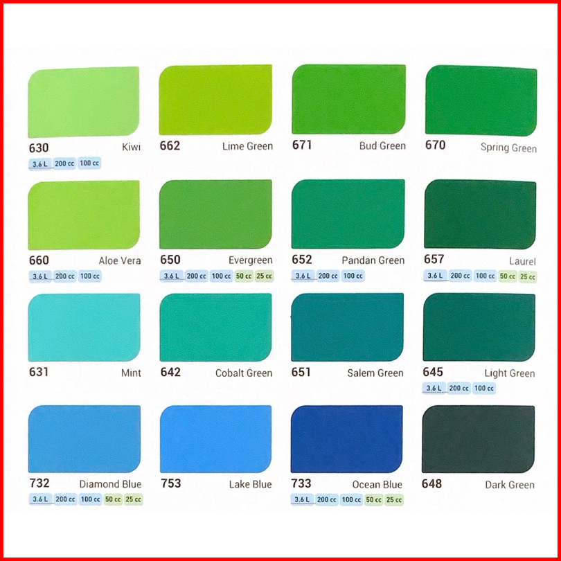 SUPER WHITE, WHITE OAKWOOD, PEARL WHITE 461, SUPER WHITE MATT, SUPER BLACK, SUPER BLACK MATT, M WHITE 100, BANANA 470, LEMONADE 480, MEDIUM YELLOW 465, PUMPKIN ORANGE 179, CHILE RED 178, VERMILLION 192, SUNRISE 191, MAROON 194, GOLDEN BROWN 329, COPRA BROWN 330, MAHOGANY BROWN 331, GOLDEN HONEY 328, CARAMEL APPLE 333, CANDY BROWN 301, CINNAMON 309, KIWI 630, LIME GREEN 662, BUD GREEN 671, SPRING GREEN 670, ALOE VERA 660, EVERGREEN 650, PANDAN GREEN 652, LAUREL 657, MINT 631, COBALT GREEN 642, SALEM GREEN 651, DIAMOND BLUE 732, OCEAN BLUE 733, DARK GREEN 648, BRIGHT BLUE 755, DEEP OCEAN 750, BLUE ROYAL 754, LIGHT PINK 193, CANDY PINK 198, ORCHID VIOLET 197, GRAPE 189, TWILIGHT BLUE 731, DOVE GREY 911, DARK GREY 915, SUEDE 303, LEATHER 305, SADDLE BROWN 306, CARROT 160, FLAME ORANGE 190, NATURAL WHITE 110, LOVE ME TENDER, STRONG BLUE 735, 631 MINT, RED DIVINE, TINGE OF GREY, BROKEN WHITE 370, BURGUNDY SPLASH, TIMELESS GREY N30, SUNKIST 199, SMALL WONDER, OH SANTORINI, MARIGOLD 44505, SEA BLUE 752, BEIGE HARMONY, COFFEE BREAK N34, SKY GARDEN, PINK PARLOR R15, G15 002 ENERGY RUN, OAK PARQUET NP, DOVER GRAY 924, QUIET VILLAGE