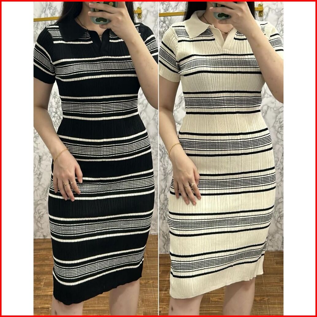 Lissai Knit Midi Dress Bodycon Korea Motif Salur Midi Dress Rajut Wanita Korean Style Lengan Pendek