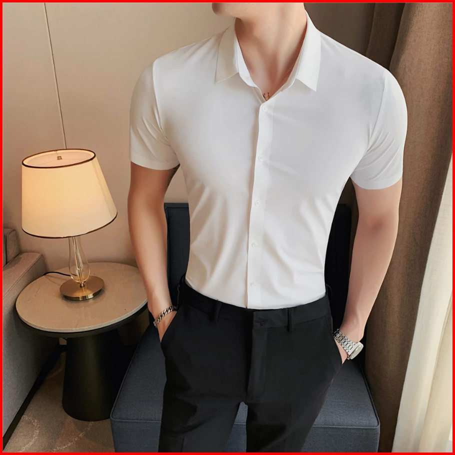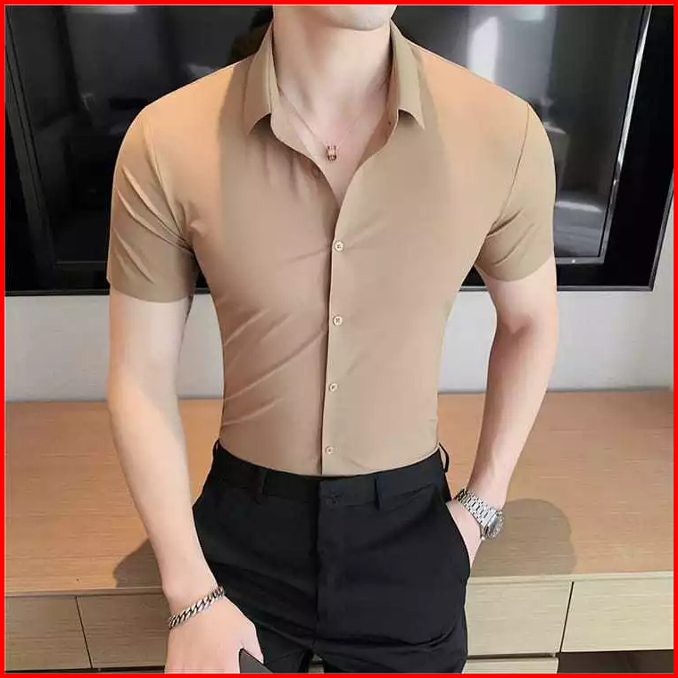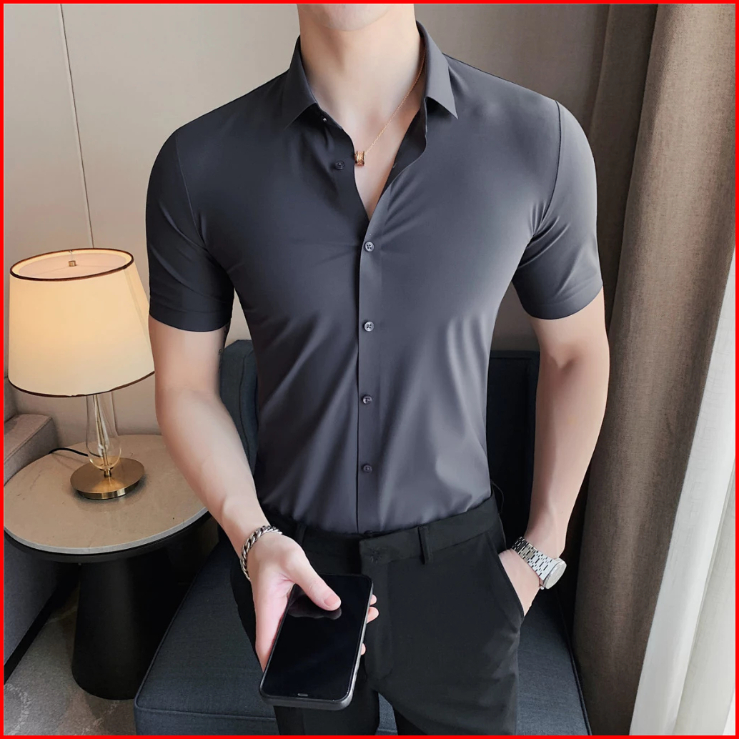 Kemeja Pria Elastis Lengan Pendek Polos Bahan Katun Slim Fit Hem Modern Cowok Premium Warna Abu
