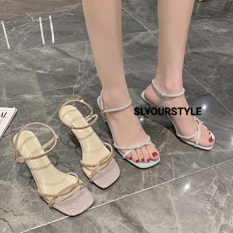 Sandal Heels Hak Kaca 7 cm Strap Permata