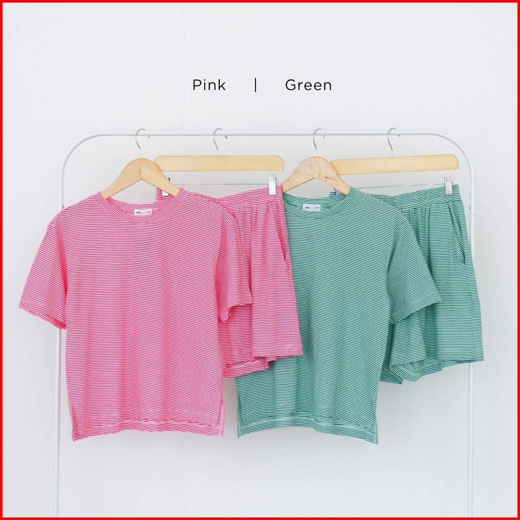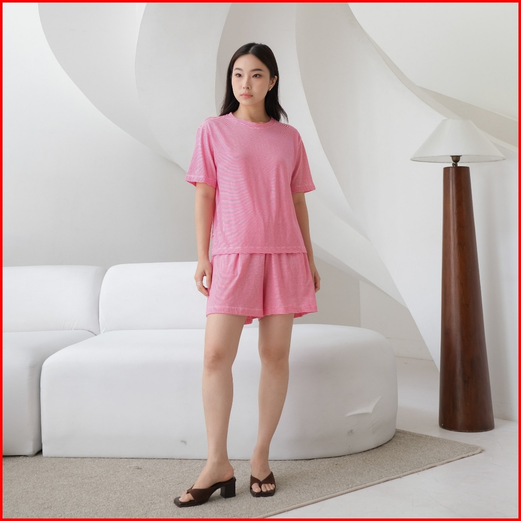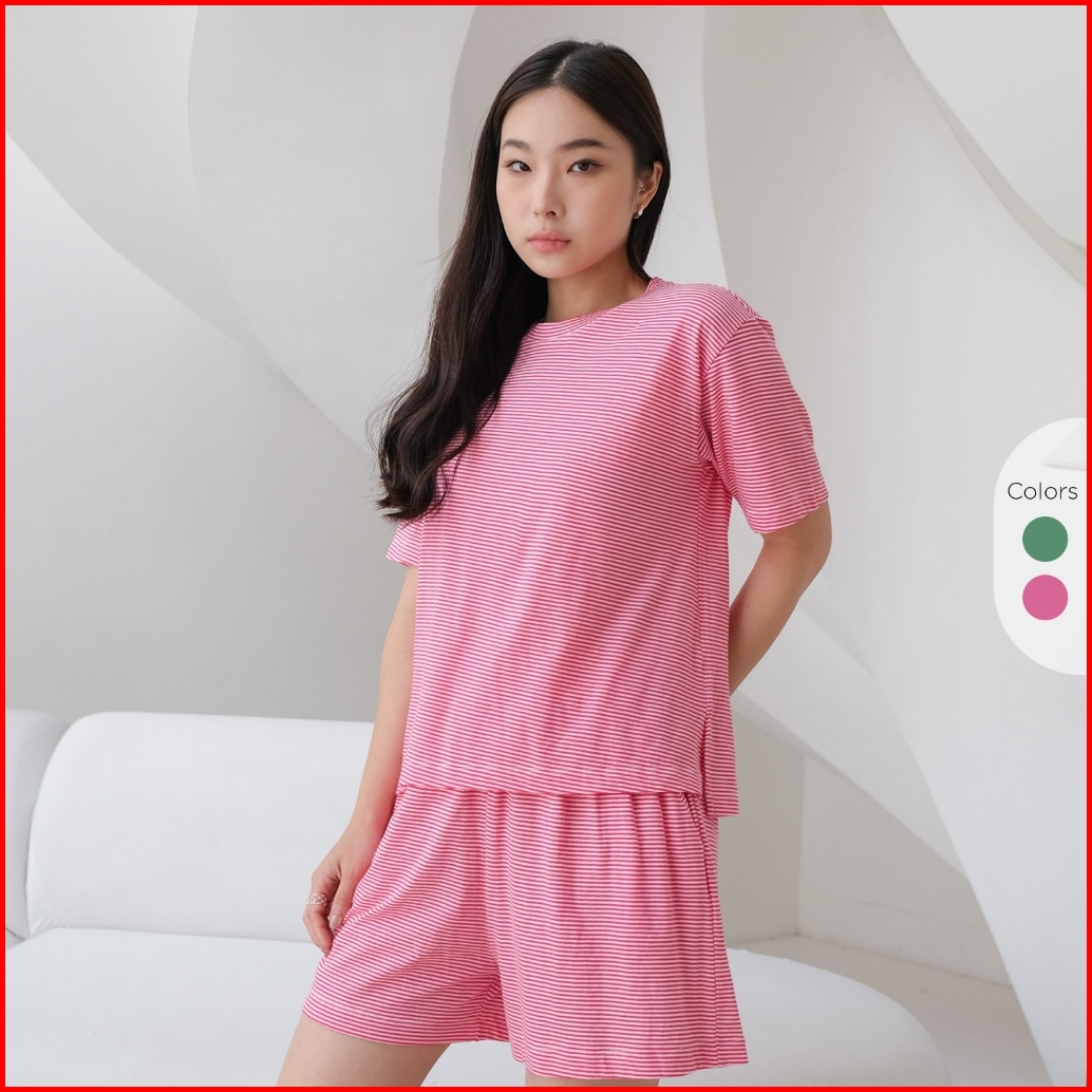 Isla Hyejin Stripe Set - T-shirt Wanita Lengan Pendek - Baju Santai Wanita - Baju Set Atasan Dan Bawahan - Baju Piyama