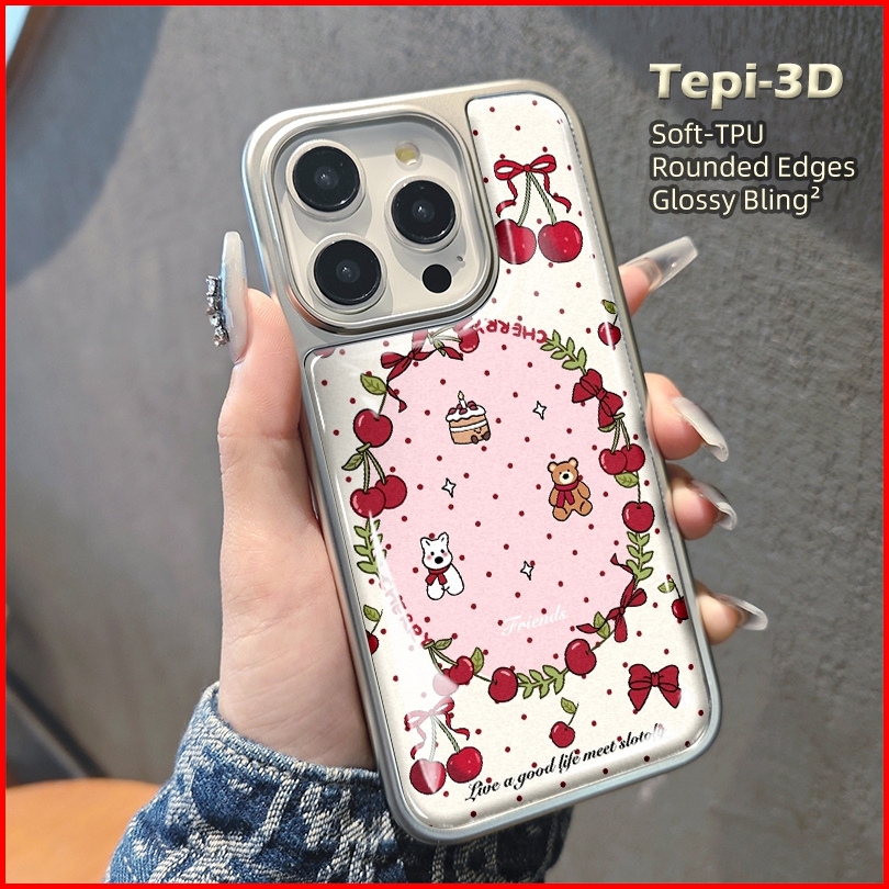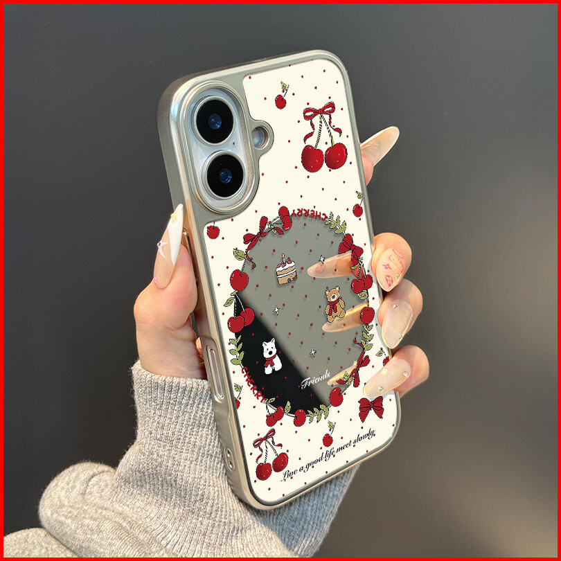 Cute Cherry Bling Bling Cermin Hologram Case Hp Iphone 16 13 15 11 12 11 14 Pro Max Silver Cewek Coquette Aesthetic Prem