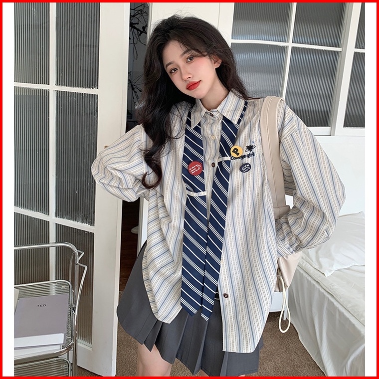 Rosella Lengan Panjang Atasan Kemeja Longgar Gaya Korea Stripe Kemeja Wanita Bonus Dasi Lencana