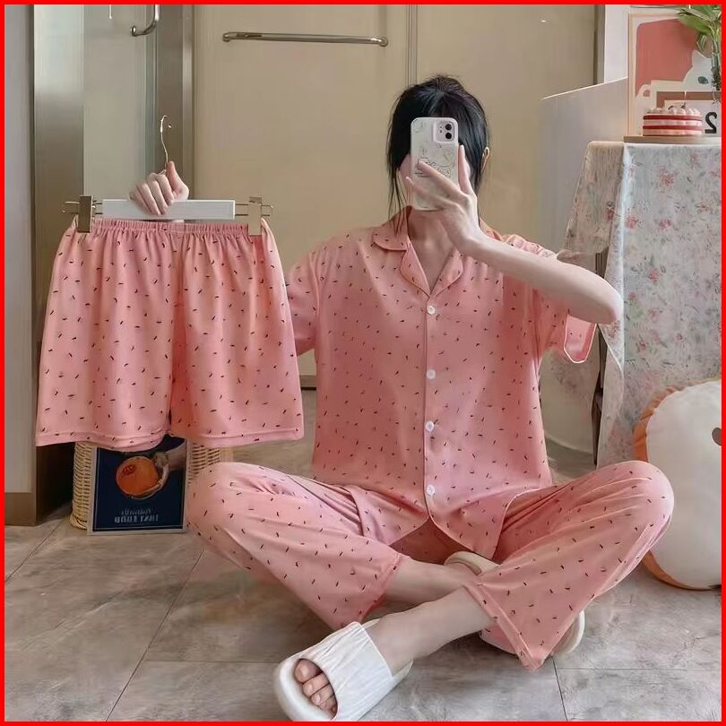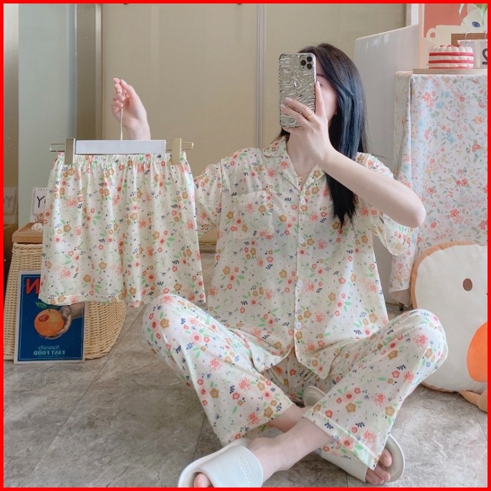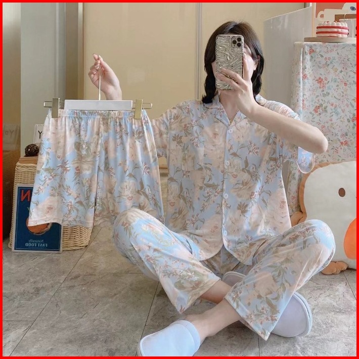 Nona Piyama Baju Tidur 3in1 Pakaian Wanita Motif Bunga Bahan Premium 017