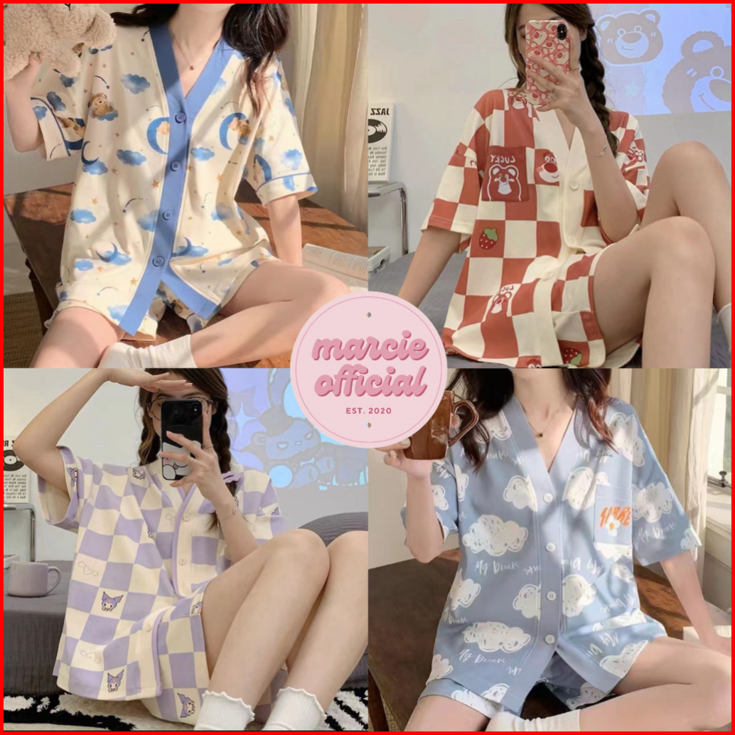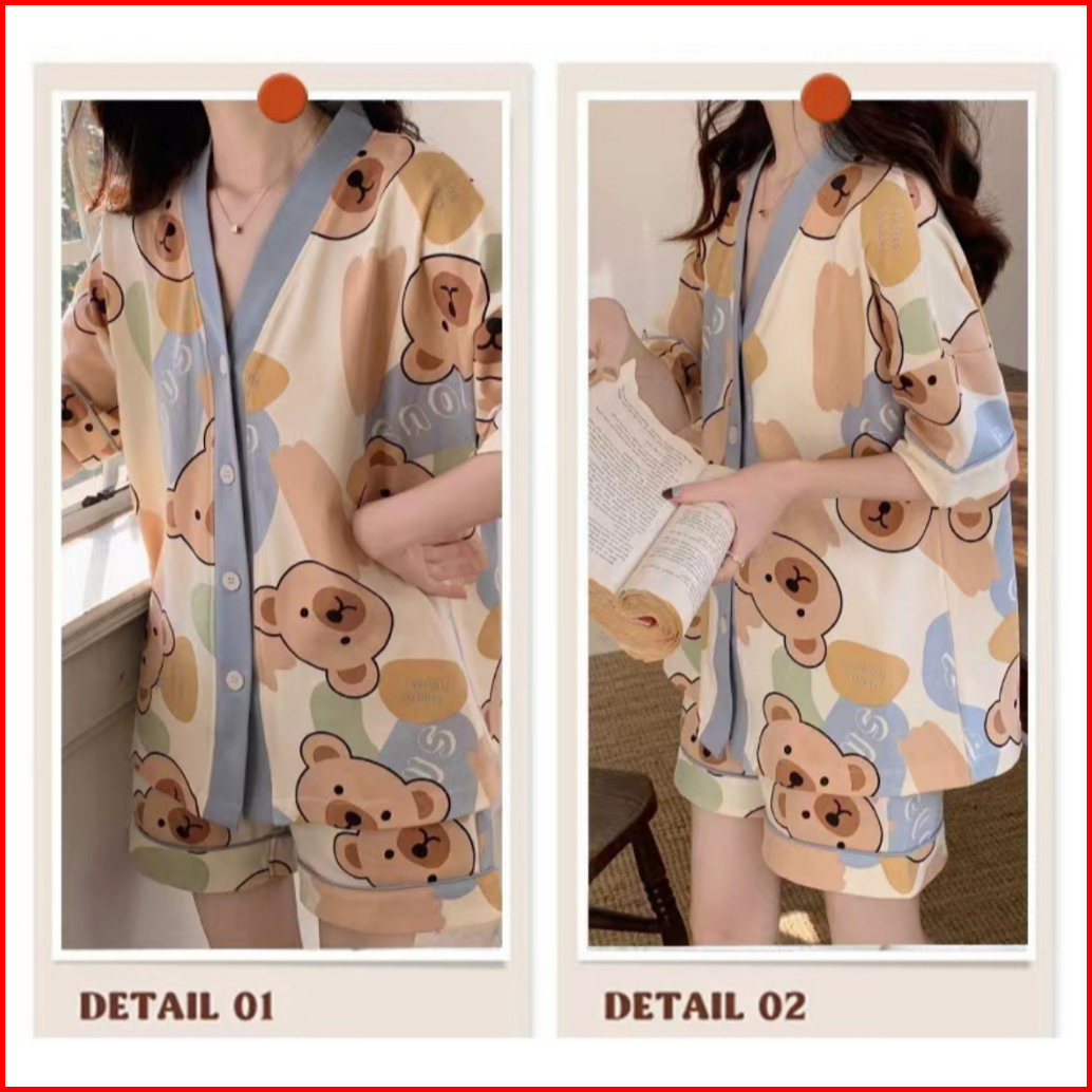 Piyama Dewasa Motif Karakter Lucu Baju Tidur Lengan Pendek Celana Pendek Full Kancing Bahan Katun Polyester Set Setelan