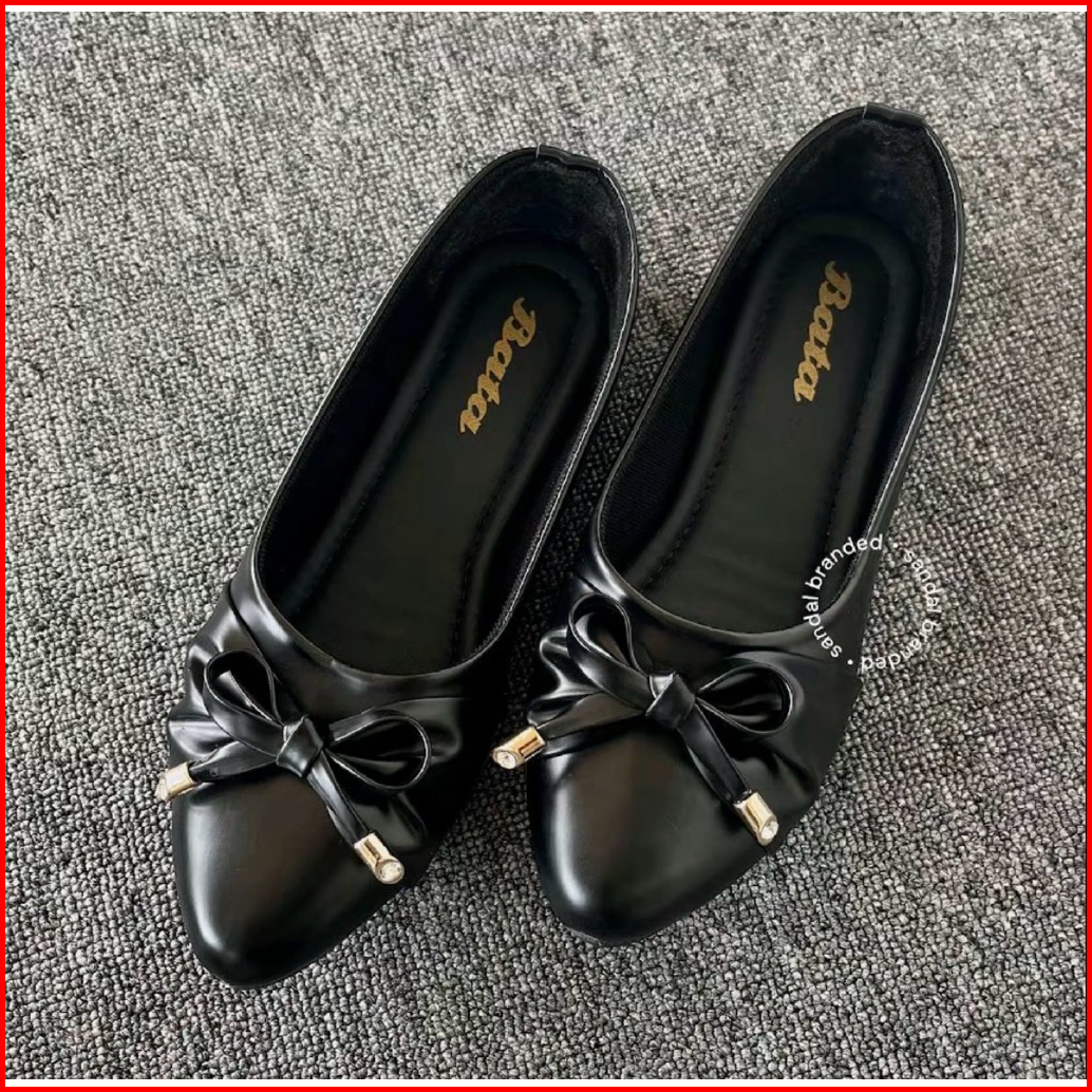 Sepatu Flatshoes Cewek Motif Pita Terbaru Sepatu Balet Wanita Kekinian Trendy 2025 Casual Kerja Hitam Putih