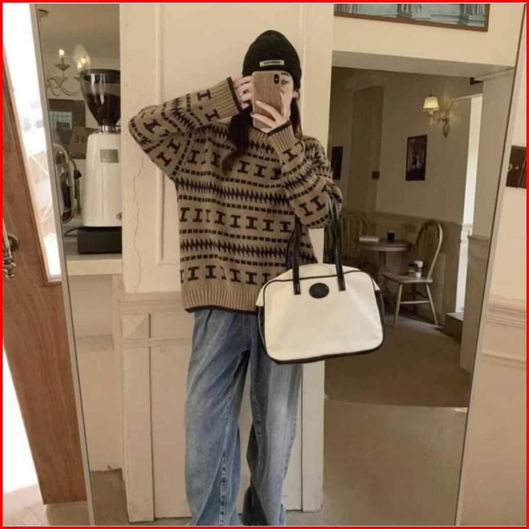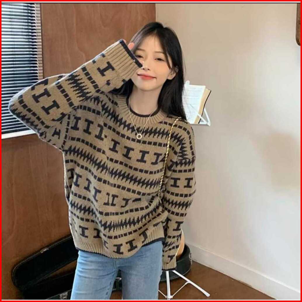 Sweater Pullover Leher Bulat Jacquard Longgar Yang Chic Untuk Wanita