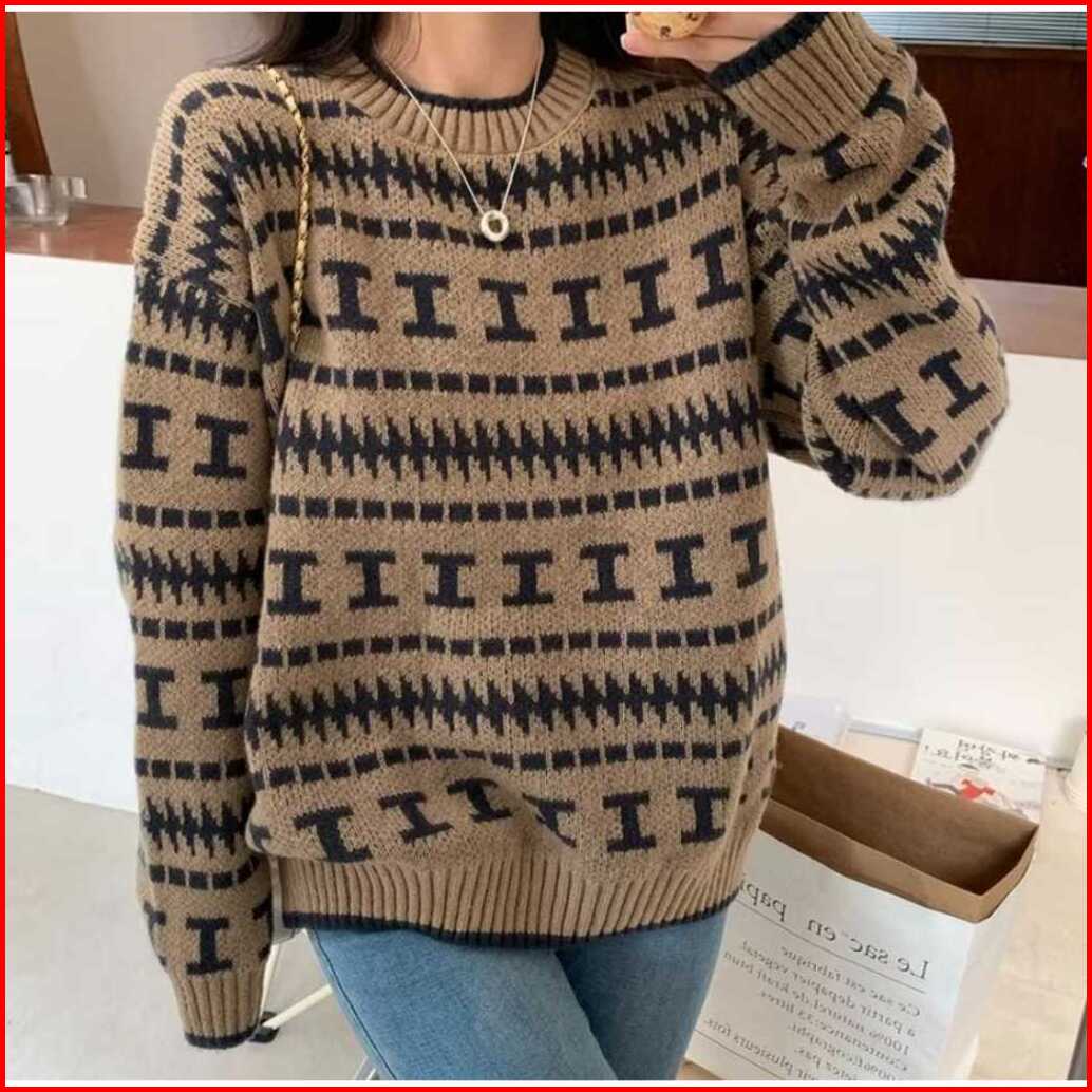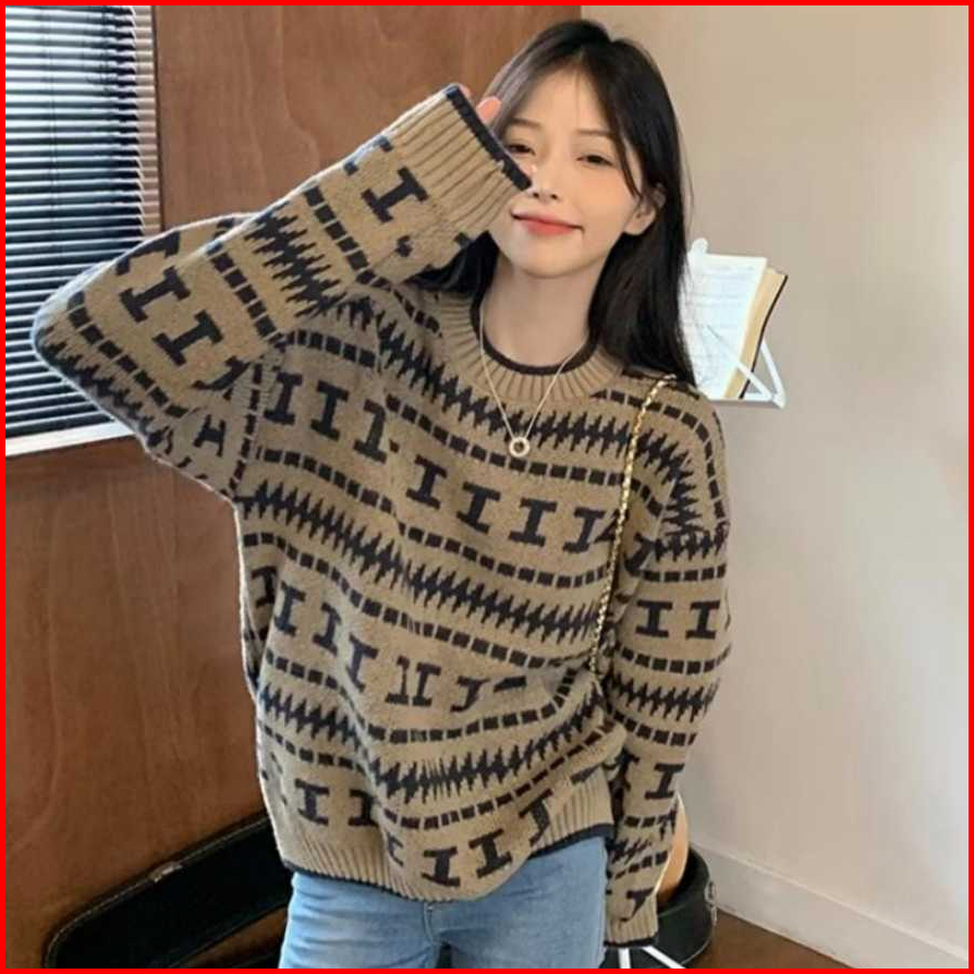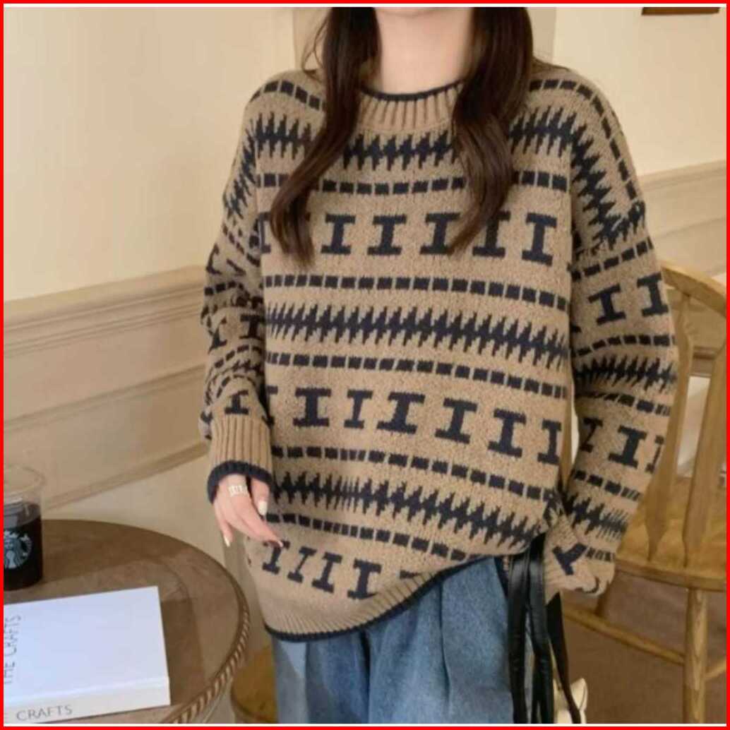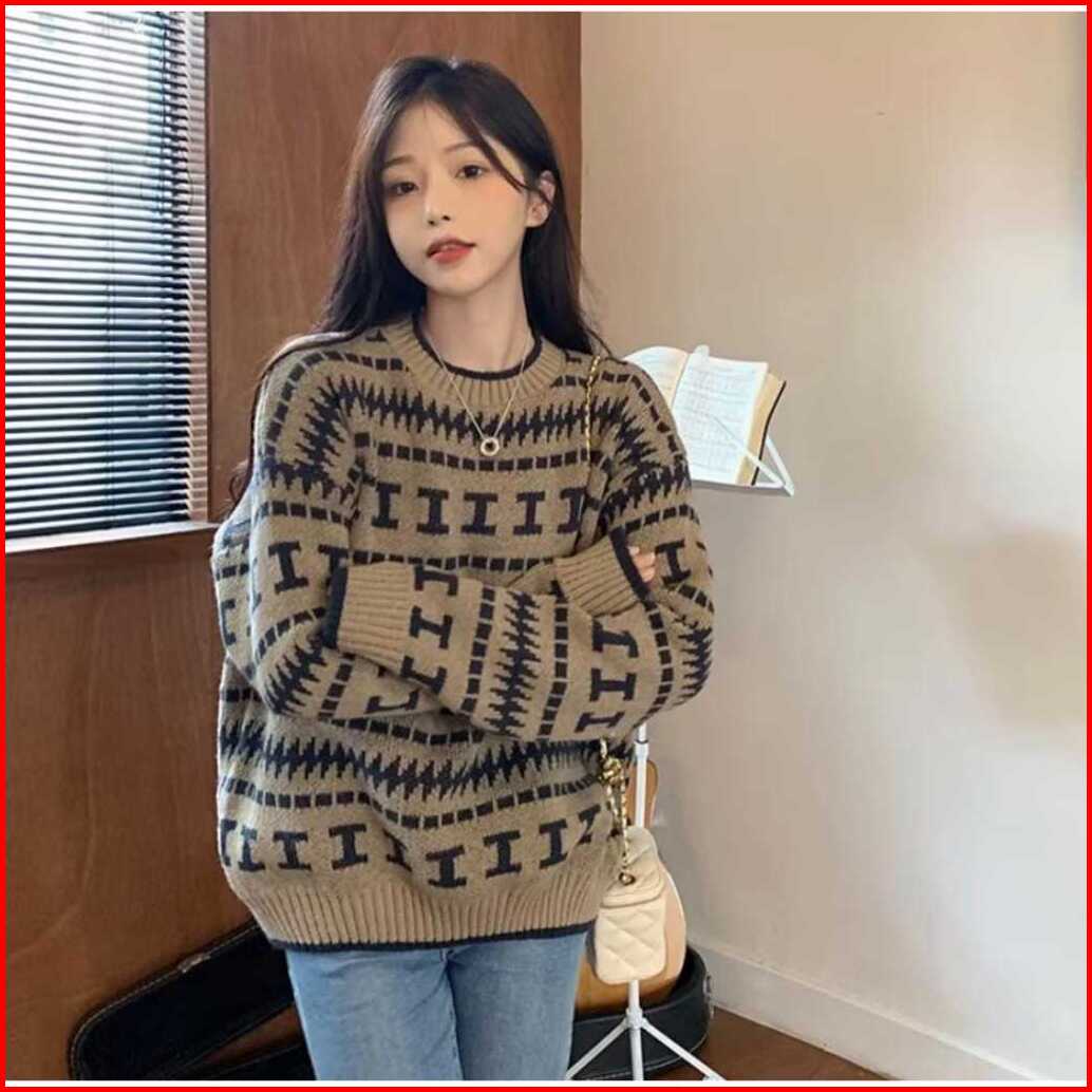 Sweater Pullover Leher Bulat Jacquard Longgar Yang Chic Untuk Wanita - Sweater Premium Oversize
