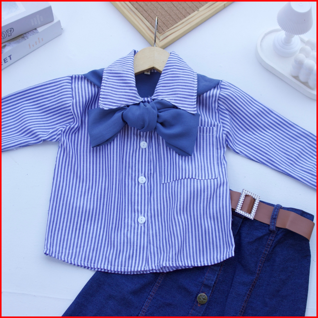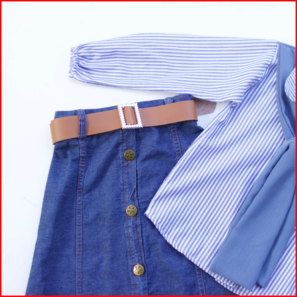 Setelan Rok Jeans Anak Lunara I Atasan Kemeja Motif Salur 1-12 Tahun I Oneset Rok Anak Kekinian