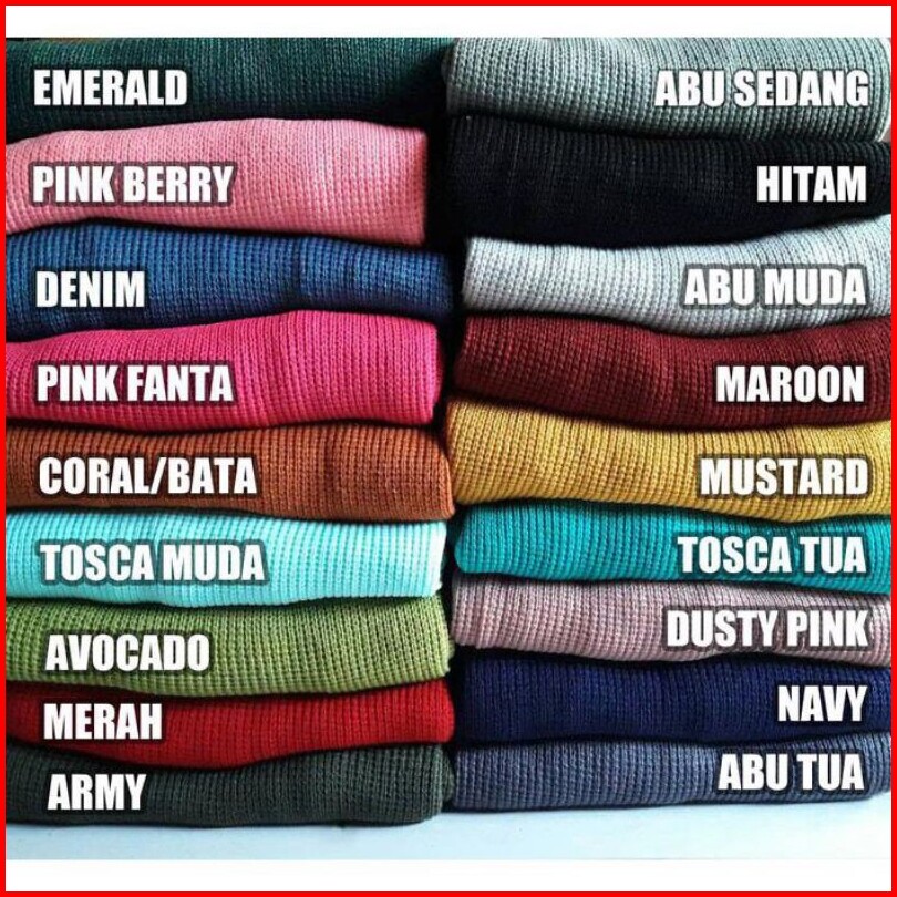 Putih, Hitam, EMERALD, MERAH CABE, MAROON, ABU MUDA, Dusty Pink, Mustard, Abu Tua, MOCCA, CORAL, Hijau Army, PINK BERRY, BIRU NAVY, UNGU LILAC, MERAH FANTA fuchsia, BURGUNDY / MILO