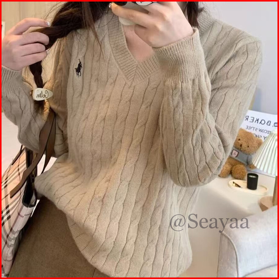 Ready Wanita Pas Sweater Vintage V-neck Rajutan Lengan Panjang Kain Tebal Halus