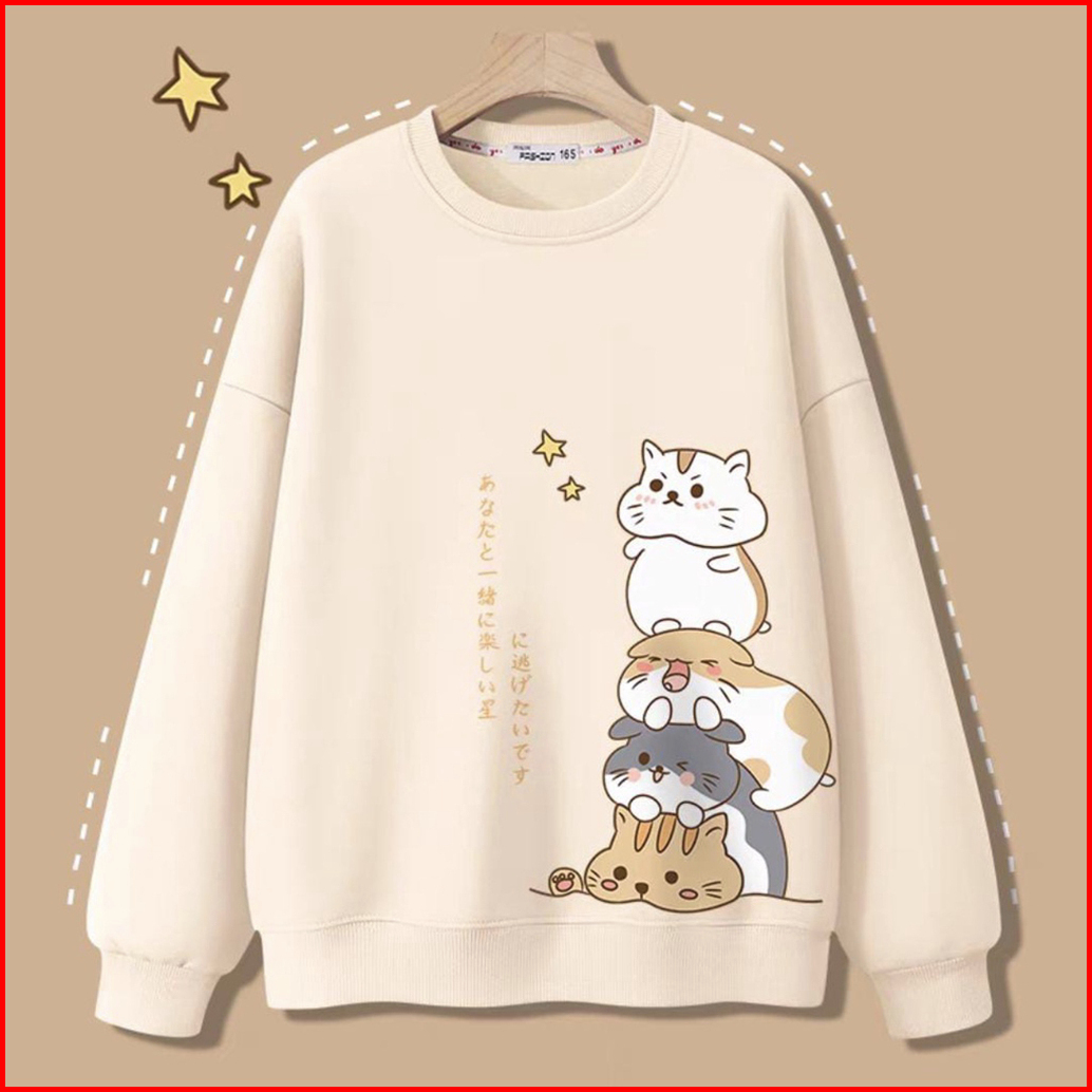 Tf - Four Cat Sweater Wanita Korean Style Sweatshirt Oblong Remaja Family Cat Crewneck Kekinian