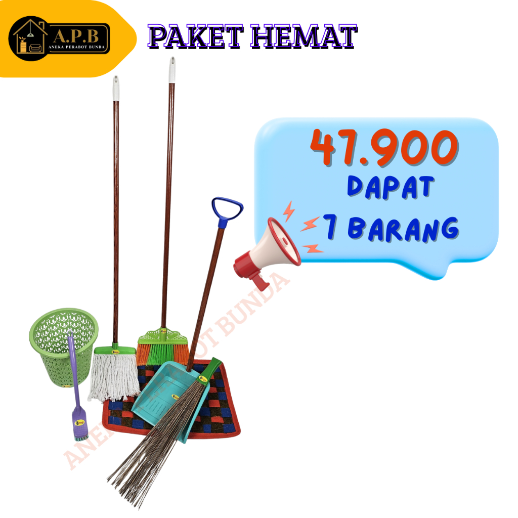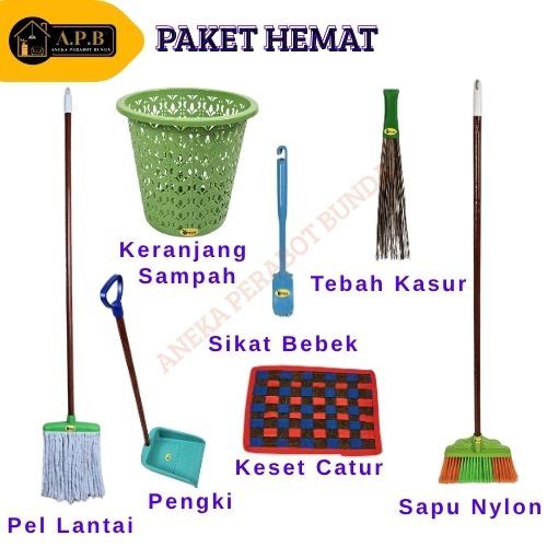 PAKET HEMAT ALAT KEBERSIHAN 7 BARANG, Sapu Nylon - Pengki - Pel Lantai - Keranjang Sampah - Tebah Kasur - Keset Catur - Sikat Bebek