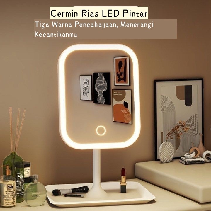 Cermin Rias LED dengan Pencahayaan Tiga Warna, Cermin Pintar dengan Lampu, Dapat Diatur, untuk Kamar Kos dan Meja