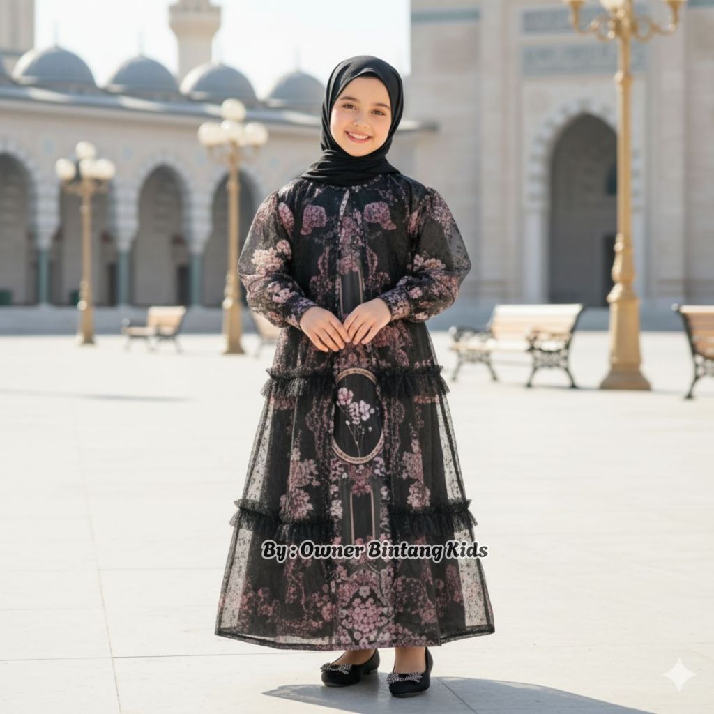 GAMIS AYESHA RAYA SULTAN MIX TILLE GLITER ANAK PEREMPUAN USIA 3 - 11 TAHUN / BAJU GAMIS RAYA ANAK MOTIF BUNGA FREE HIJAB