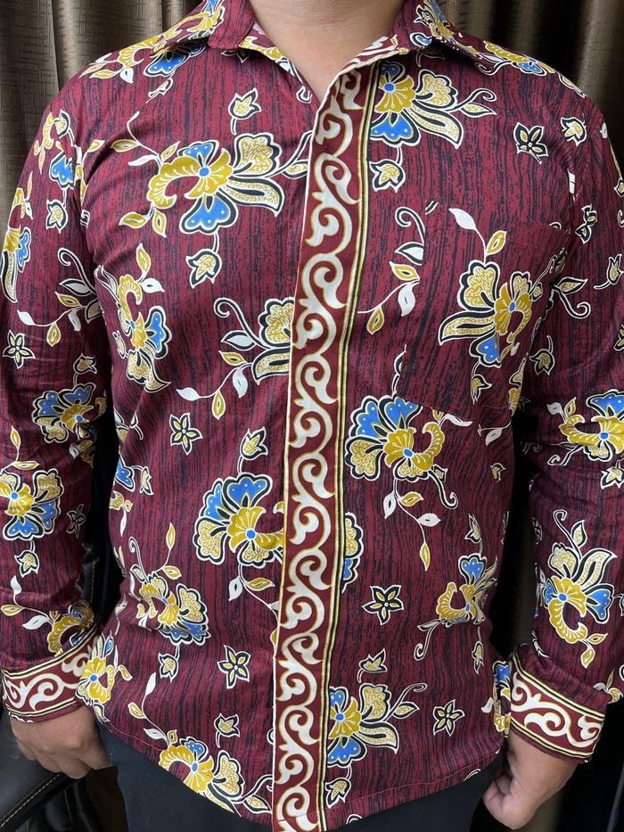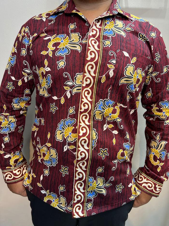 ALTHREE Clothing - KEMEJA Maroon PRIA LENGAN PANJANG Batik Katun Stretch Baju Motif Kerah - MAROON L