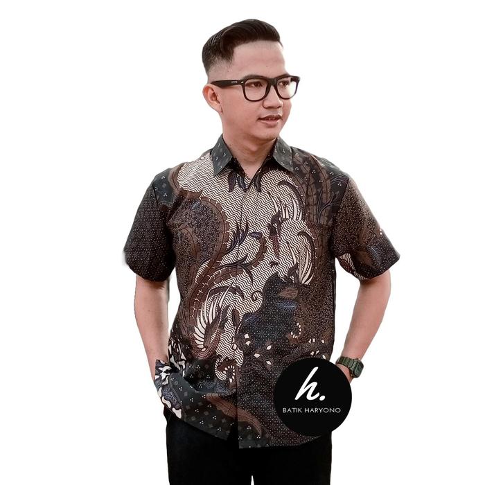 Baju Batik Pria Dewasa Mewah Terbaru Hem Murah Kemeja Lengan Pendek Pekalongan Modern motif printing - Hitam M