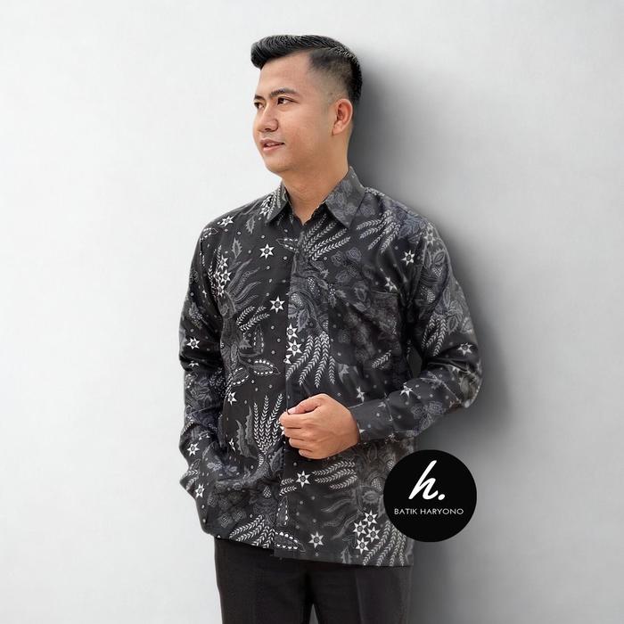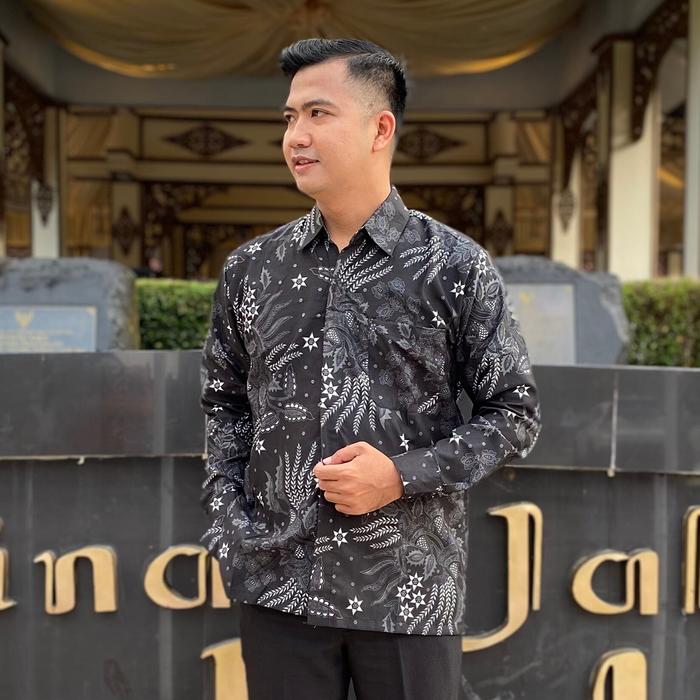 Baju Batik Pria Murah Kemeja Lengan Panjang Dewasa Seragam Kerja Kantor Modern Terbaru motif printing - Black M