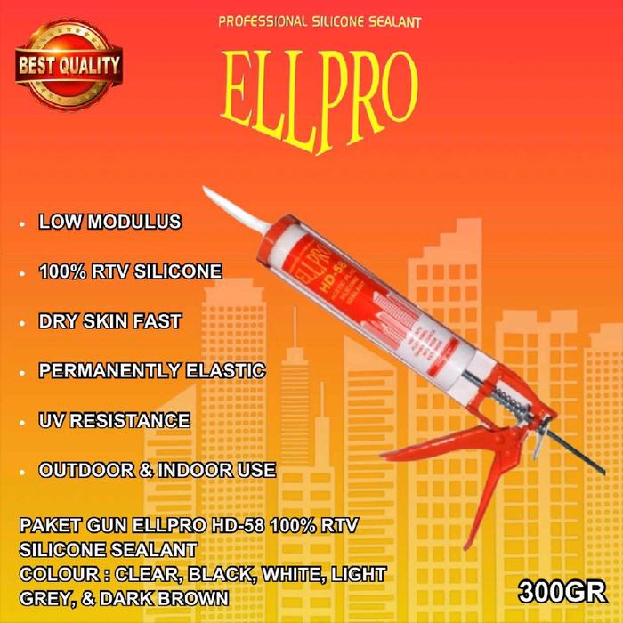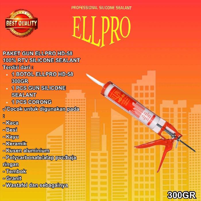 Paket Gun+Lem Silikon Kaca/Aquarium/Wallpanel/Roofing ELLPRO HD 58 High Density Sealant - CLEAR/BENING