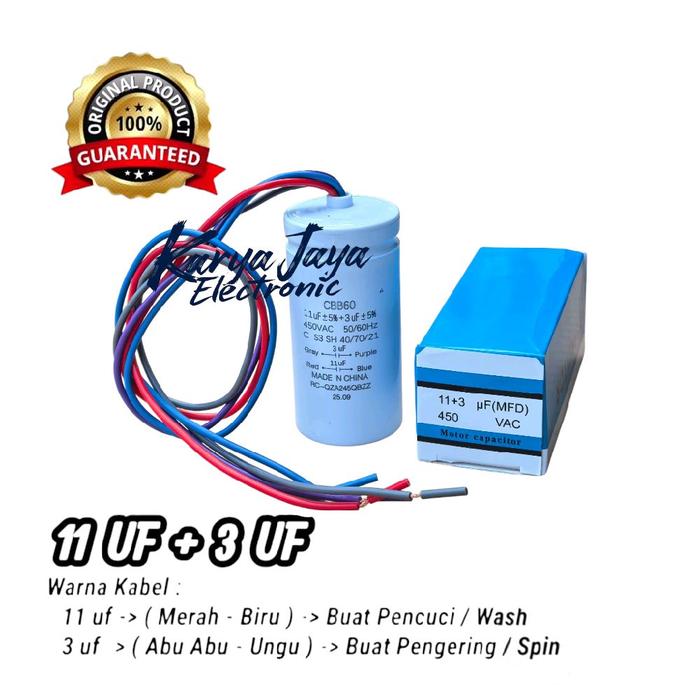 Kapasitor Mesin Cuci SH4RP 3UF + 11UF 2 Tabung Original 4 Kabel Baru Ukuran 3 UF & 11 UF