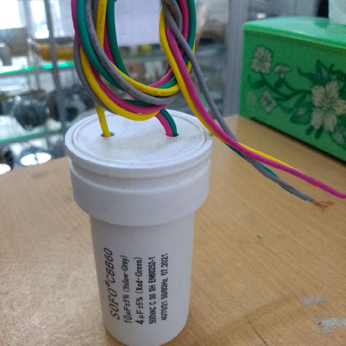 Capasitor Mesin Cuci 2 Tabung 10 UF+4 UF Sofo CBB60 untuk Mesin Cuci Dengan Dua Tabung