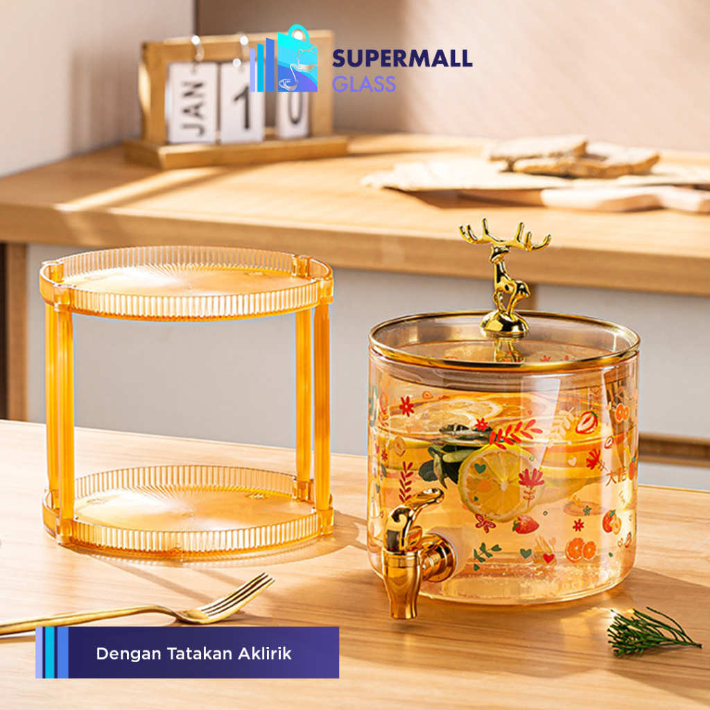 SG Dispenser Air Kaca / Ketel Air Dingin Kaca dengan Tatakan Kayu / Tempat Minuman Es Jus 2.6L