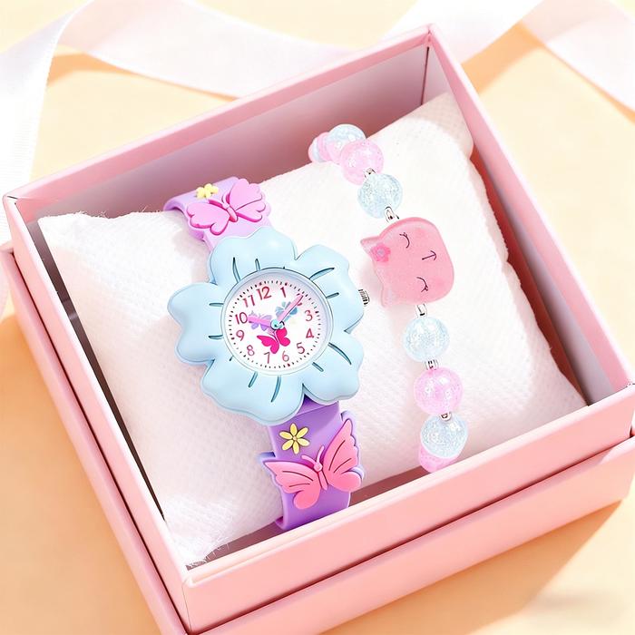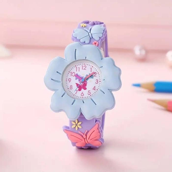 JAM TANGAN KUARSA ANAK-ANAK 3D TIGA DIMENSI KARTUN BUNGA KUPU-KUPU TALI SILIKON JAM TANGAN ANAK-ANAK - PURPLE+BRACELET+B