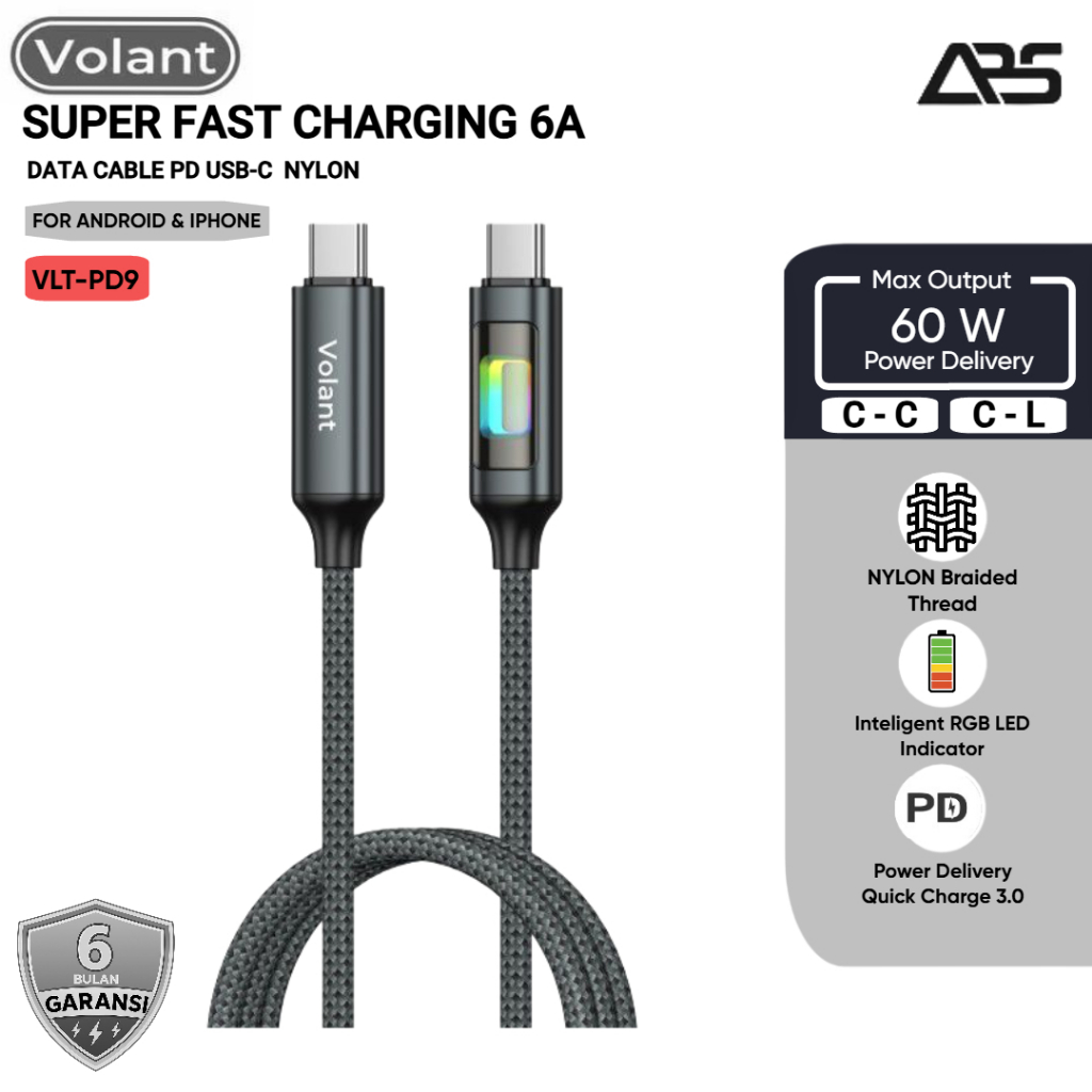 FLASH SALE VOLANT Kabel Data Fast Charging 6A 60W Kabel Charger TYPE C To C Lightning Anti Kusut USB to C 1.2M VLTPD9 Data Cable