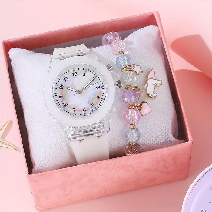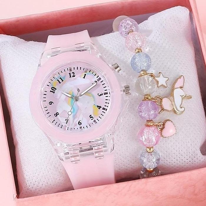 2PCS GELANG GRATIS JAM TANGAN KUARSA ANAK KARTUN SILIKON JAM TANGAN FASHION SILIKON BERCAHAYA - PINK