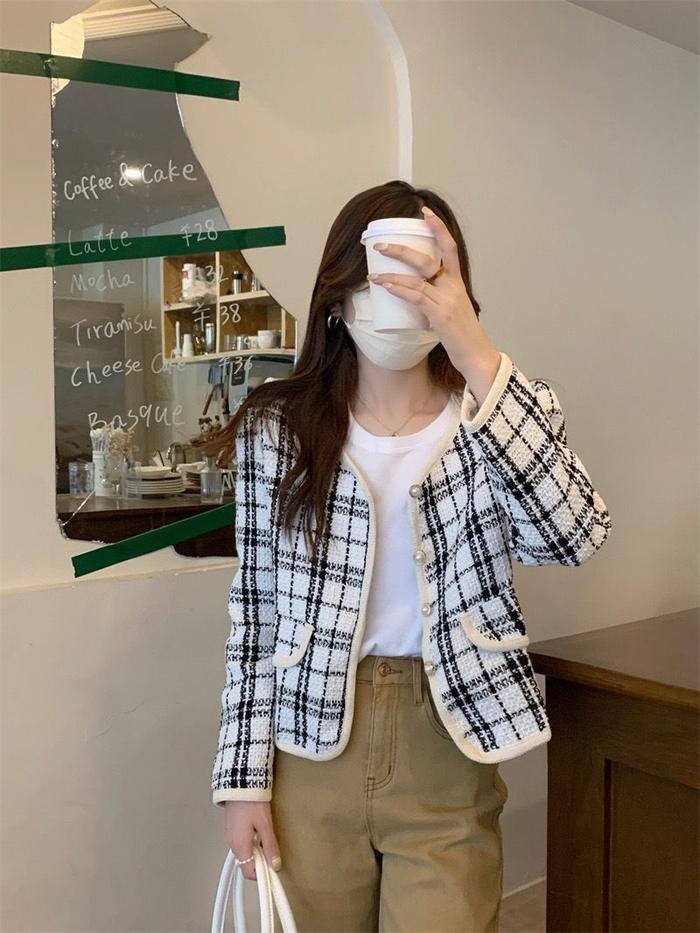 Shenel | Zola Tweed Blazer Top Blazer Tweed Kotak Baju Atasan Panjang Wanita Casual Outer Hitam Putih Formal Pita Crop