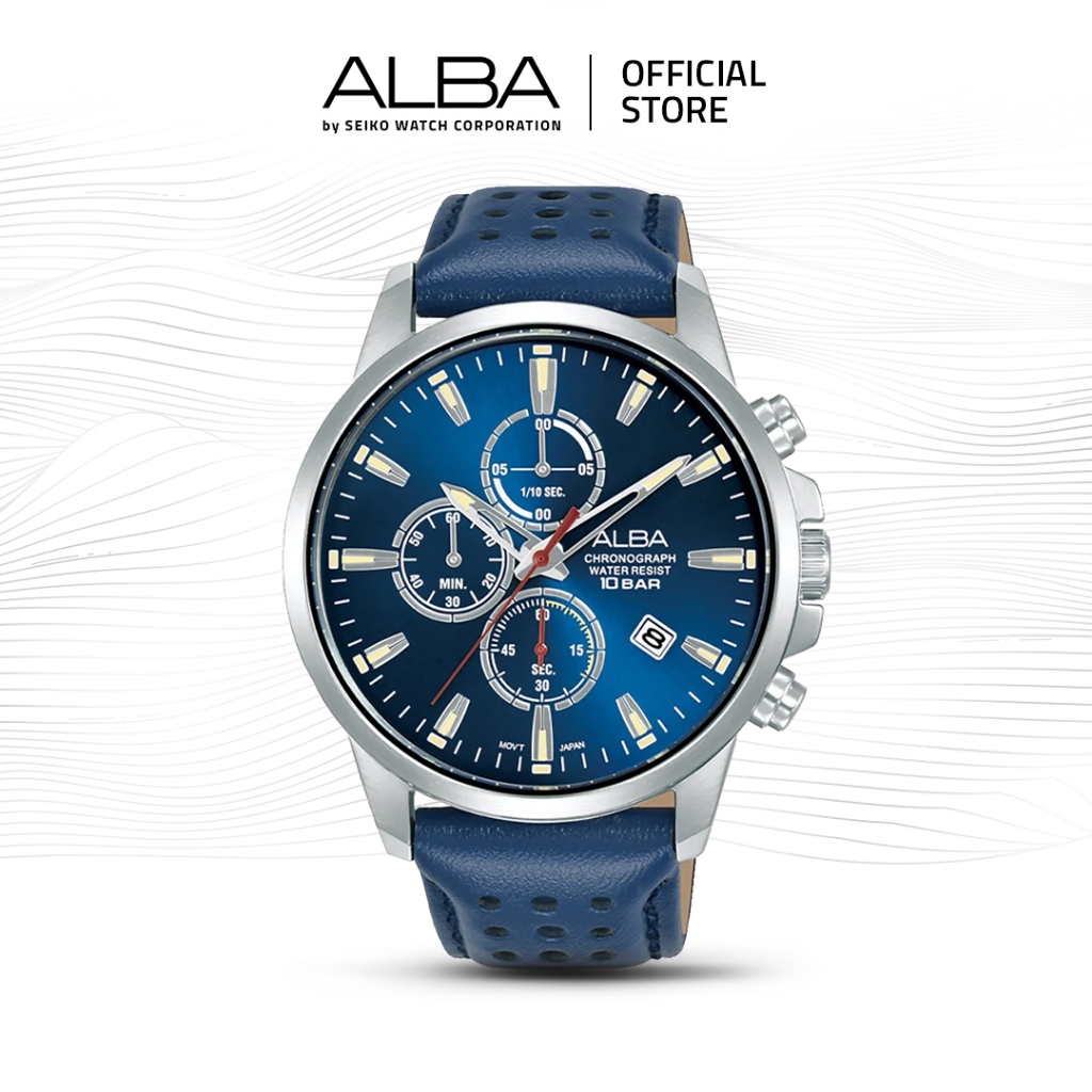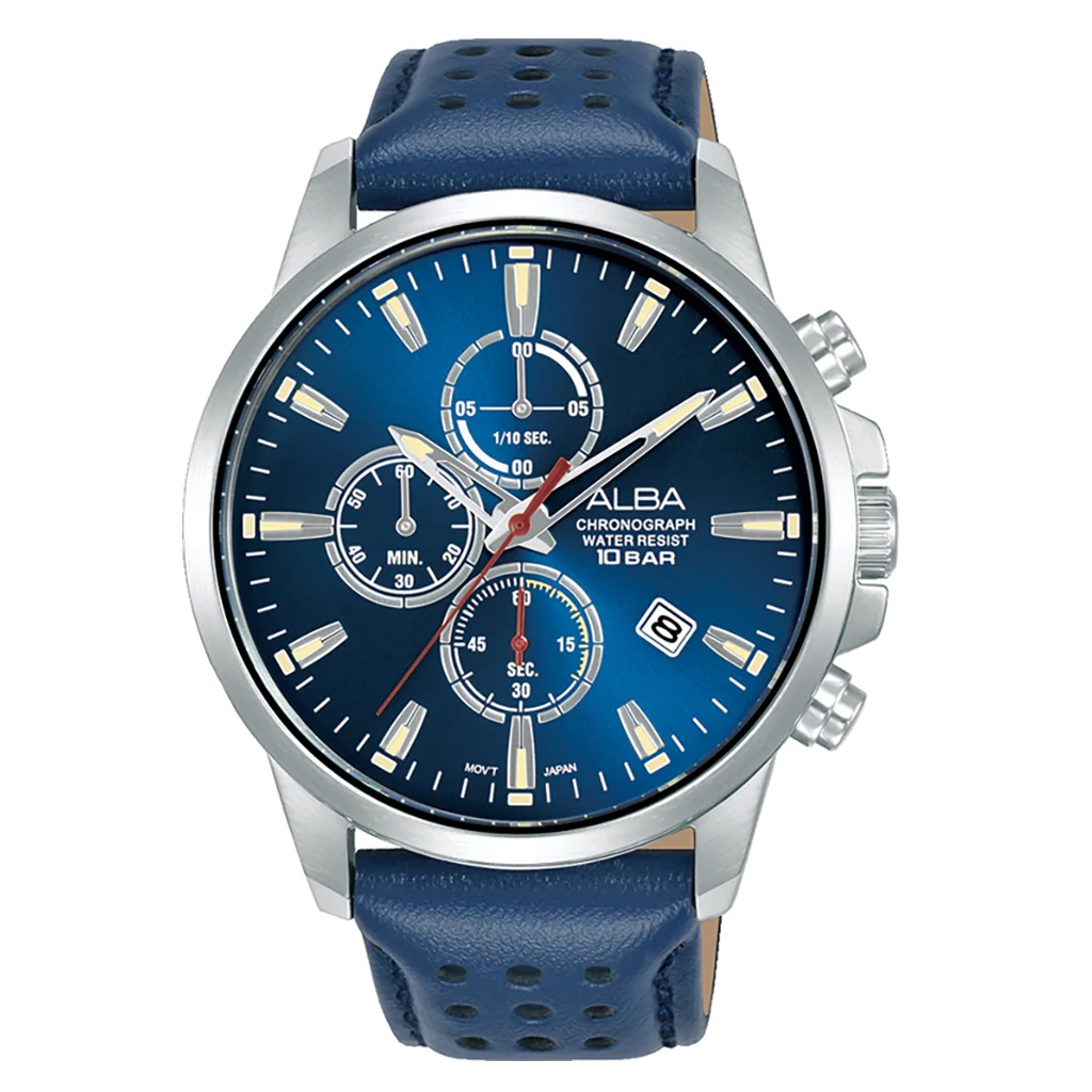 Alba Active Jam Tangan Pria Chronograph AM3917 / AM3917X1 Quartz Blue Dial Genuine Leather Strap Watch