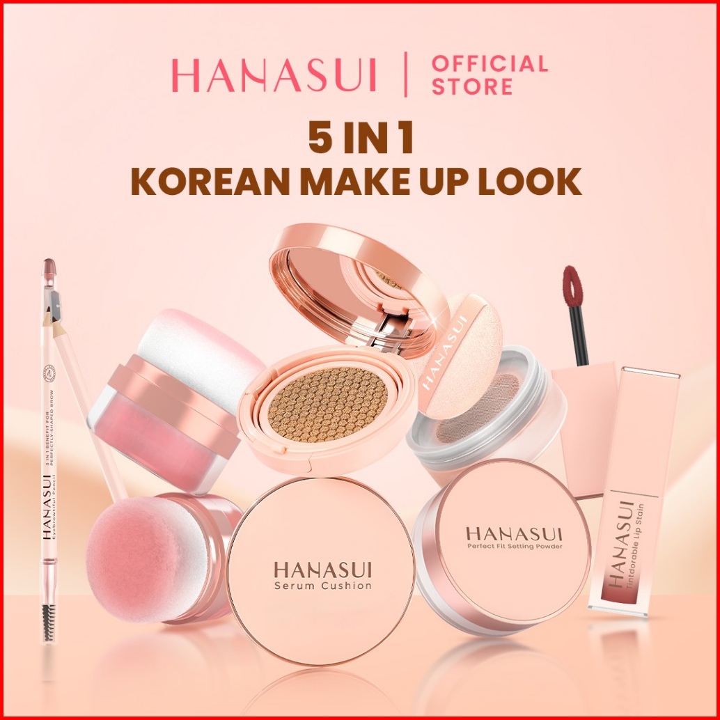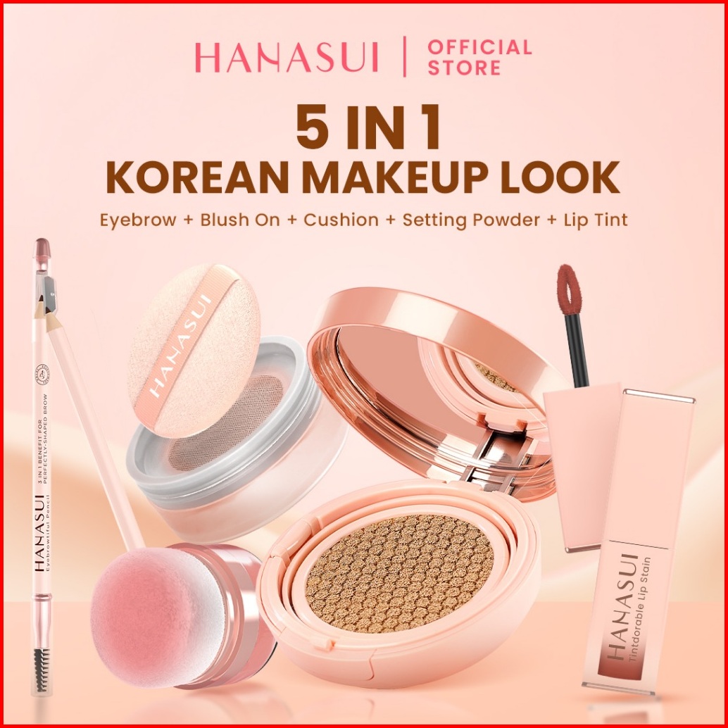 5 In 1hanasui Korean Make Up Look - 5pcs Makeup Set Cushion Blush On Liptint Eyebrow Natural Finish Setting Powder Cover