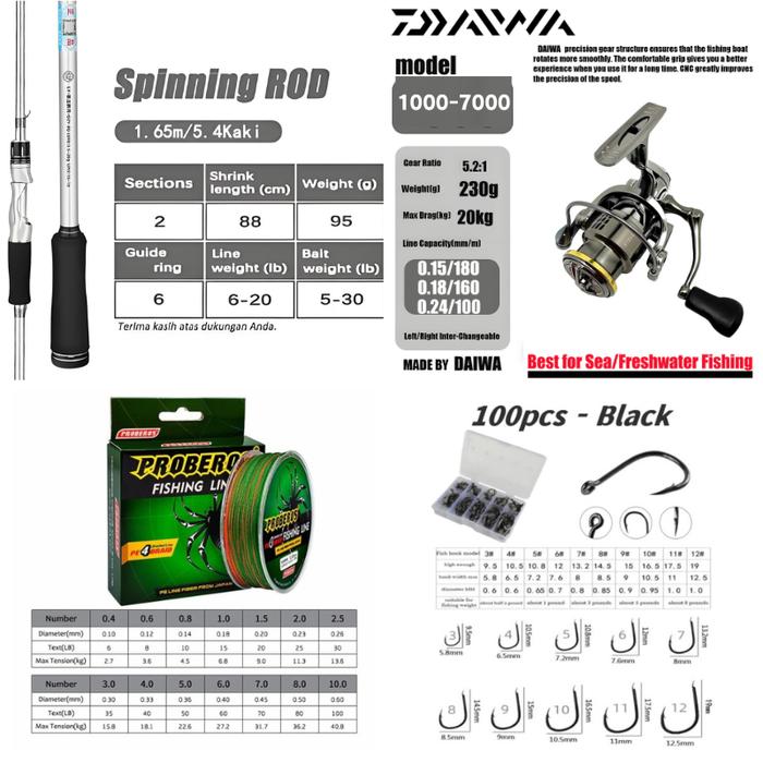 【Beli 1 Dapat 5】Paket Pancing Lengkap dengan Reel Drag Halus - Bahan Ringan & Anti Karat - DAIWA 1.65M LC1000 Full Set