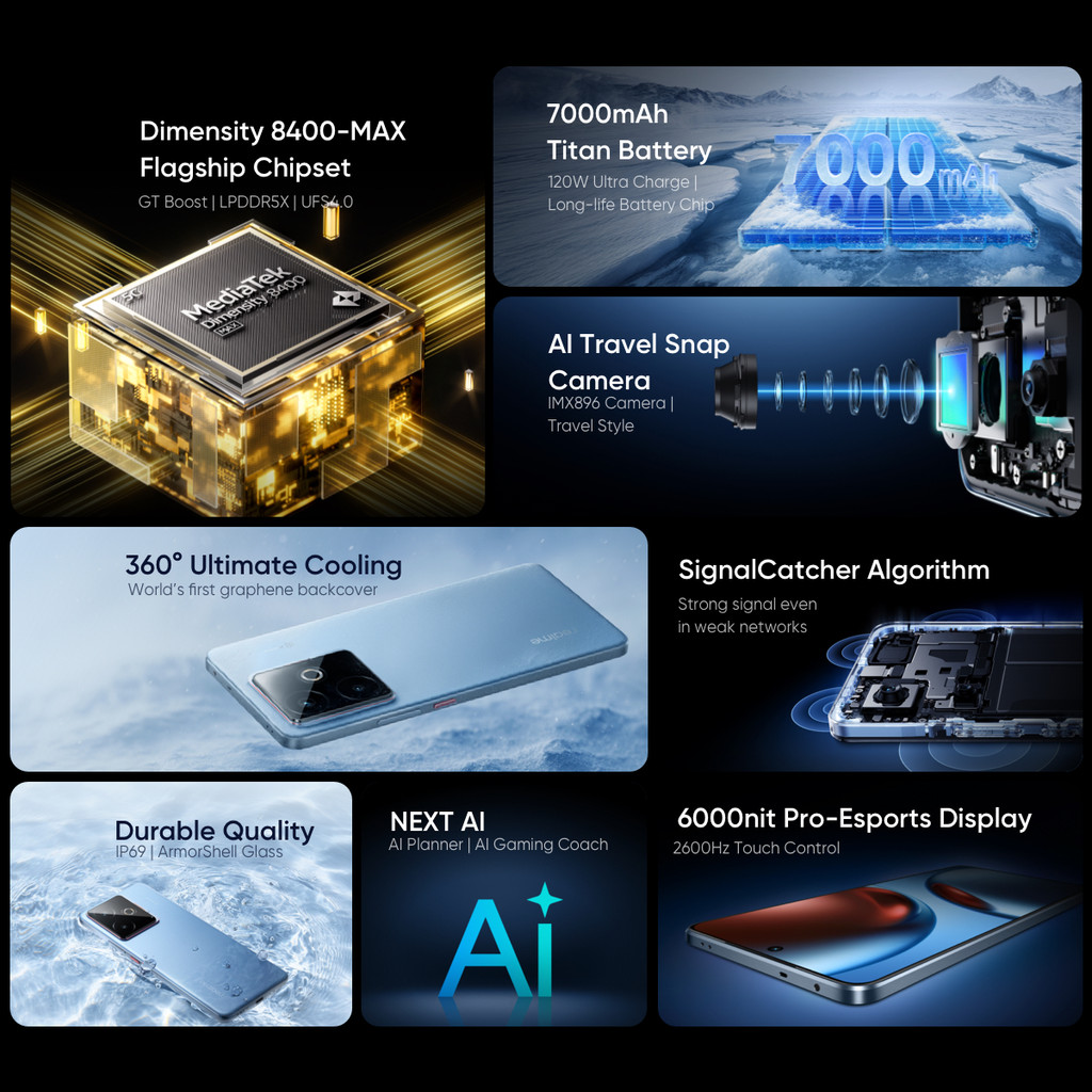 realme GT 7T 12GB+12GB256GB Dimensity 8400-MAX Flagship Chipset 7000mAh Titan Battery + 120W Ultra Charge AI Travel Snap Camera