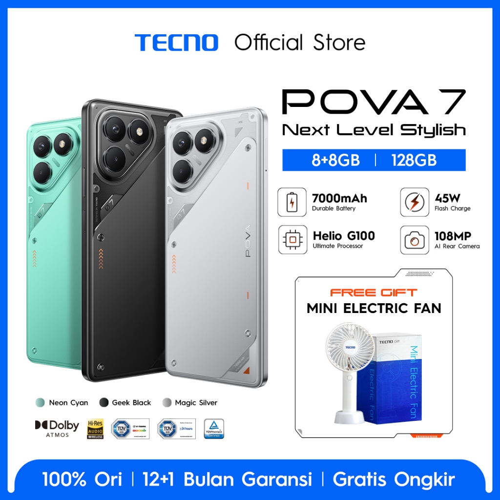 TECNO POVA 7 - 8+8GB/128GB, 7000mAh + 45W, Mediatek Helio G100 Ultimate, 120Hz Vivid Display , 108MP + 2MP Macro Camera, Android 15 - HiOS 15