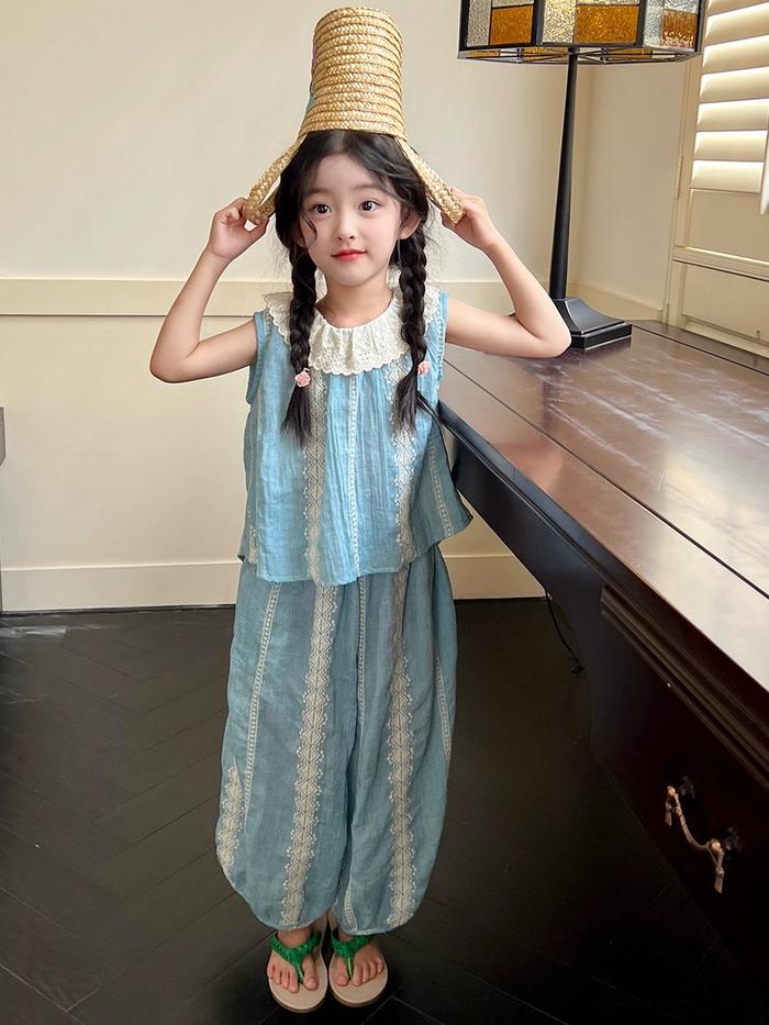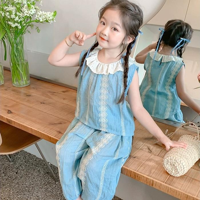 TEBARU MUSIM PANAS SETELAN ANAK PEREMPUAN BIRU IMPORT FASHION SET LACE NECKLINE KOREA STYLE BEAR PAKAIAN - 90(2-3THN)