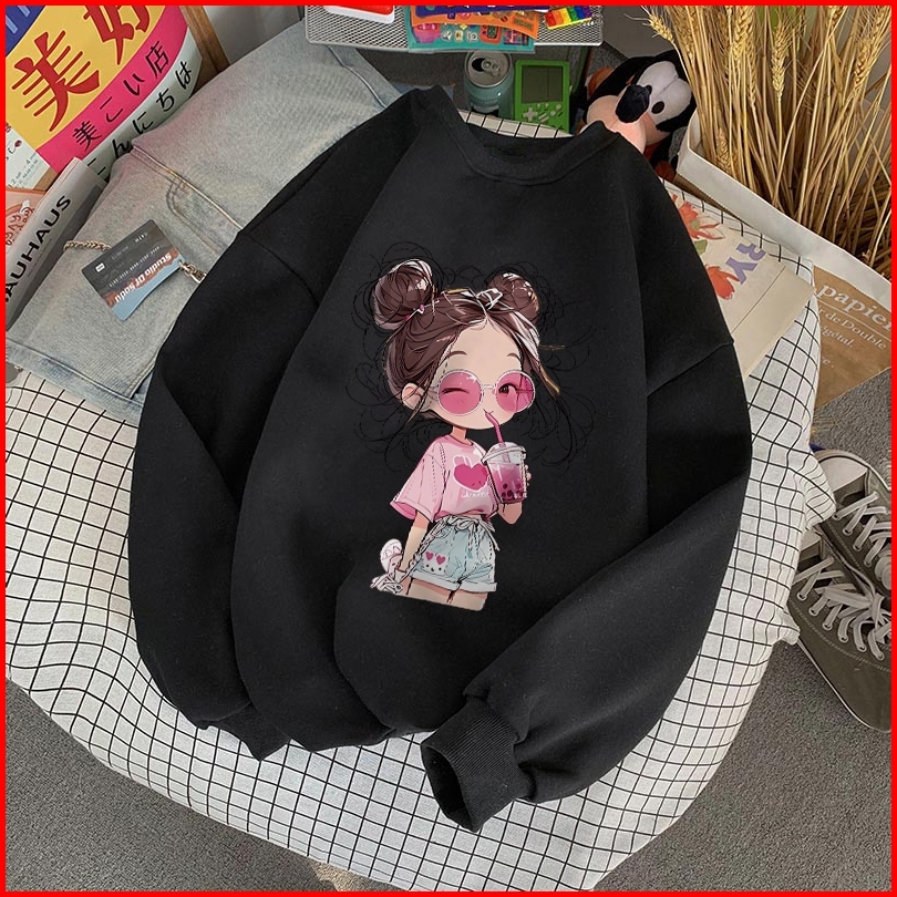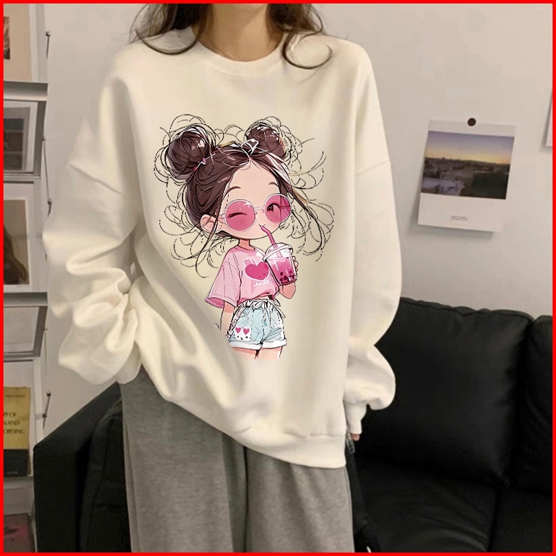 Forteid Sweater Lengan Panjang Oversized Street Style Korean Style Switer Wanita Oversize Kaos Cetakan Gambar Gadis Kart