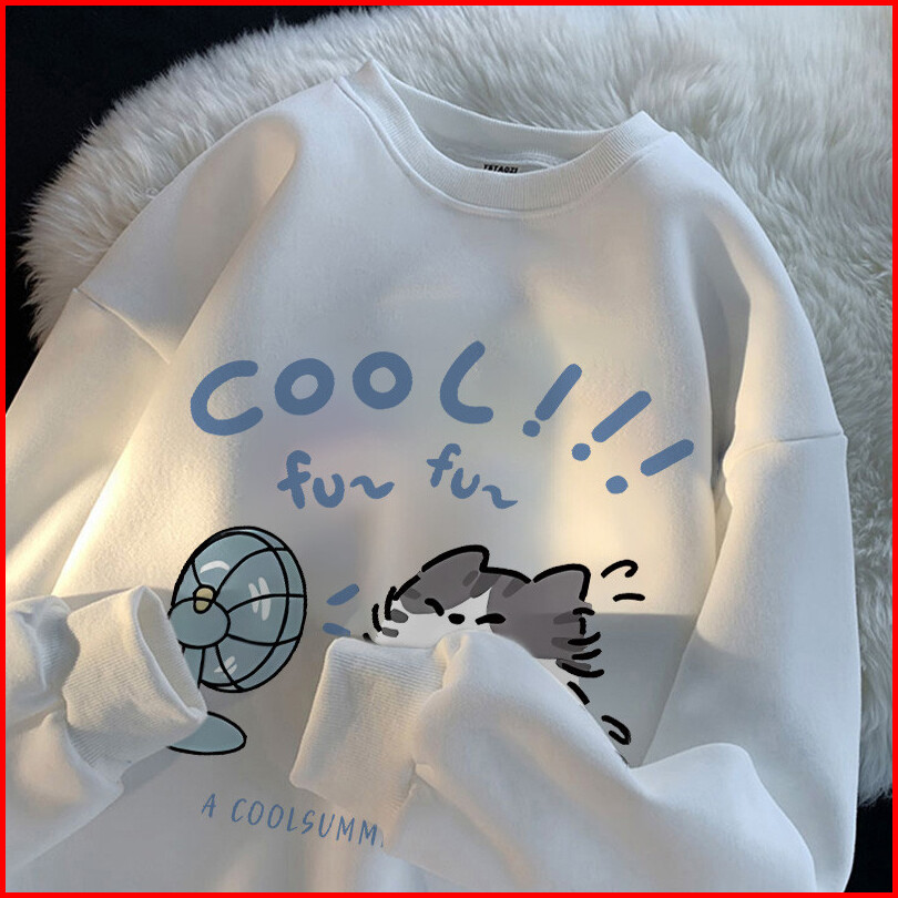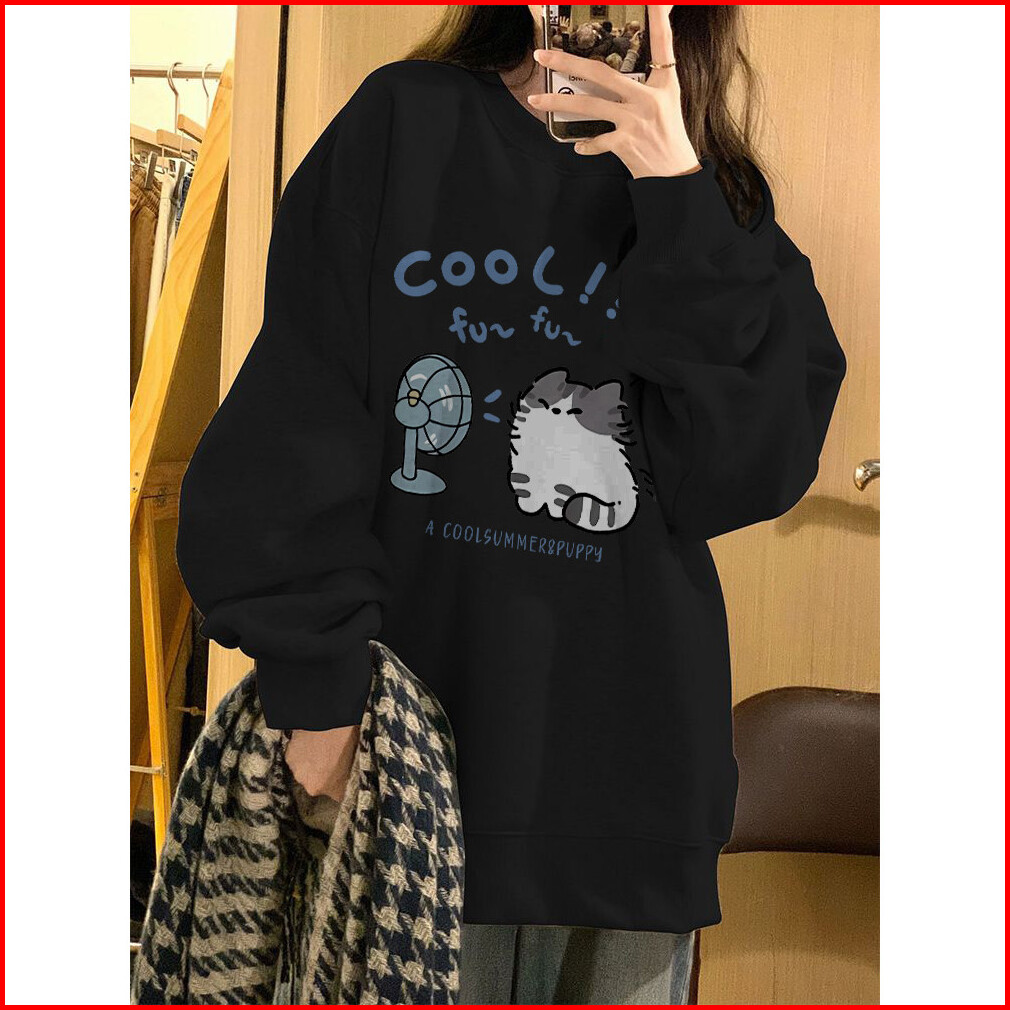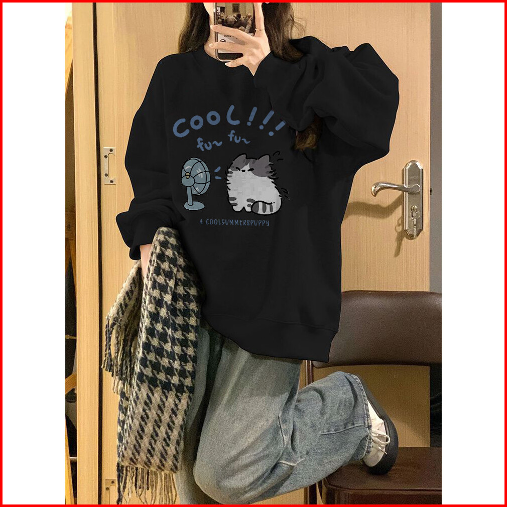 Po Floret Sweater Crewneck Oversize Wanita Blowing Kitten Print Retro Style Sweater Wanita Original 100 Cotton Tebal
