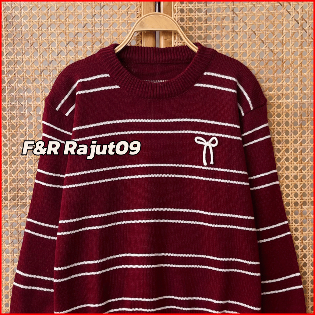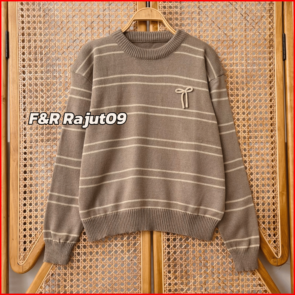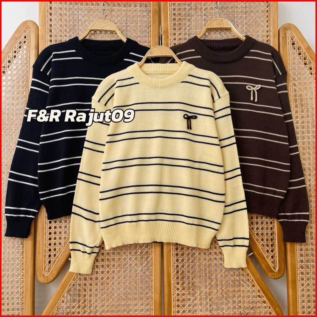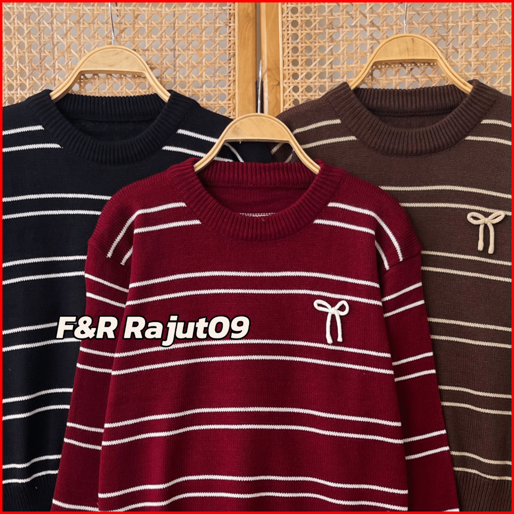 F R Tesyaa Blouse Knit - Atasan Sweater Rajut Crop Wanita Motif Pita Stripe Kerah Bulat Lengan Panjang Korean Style