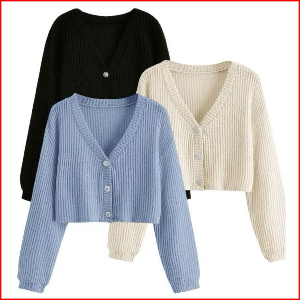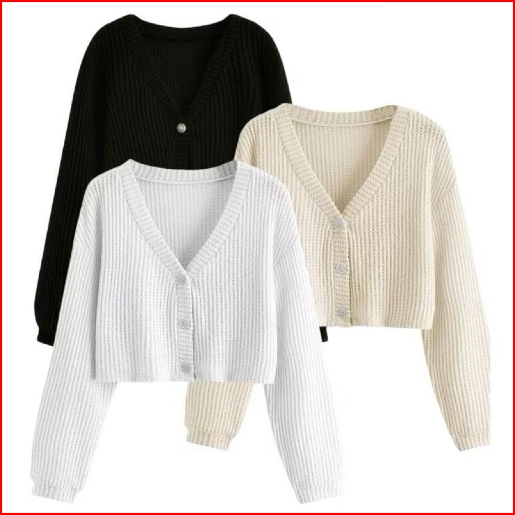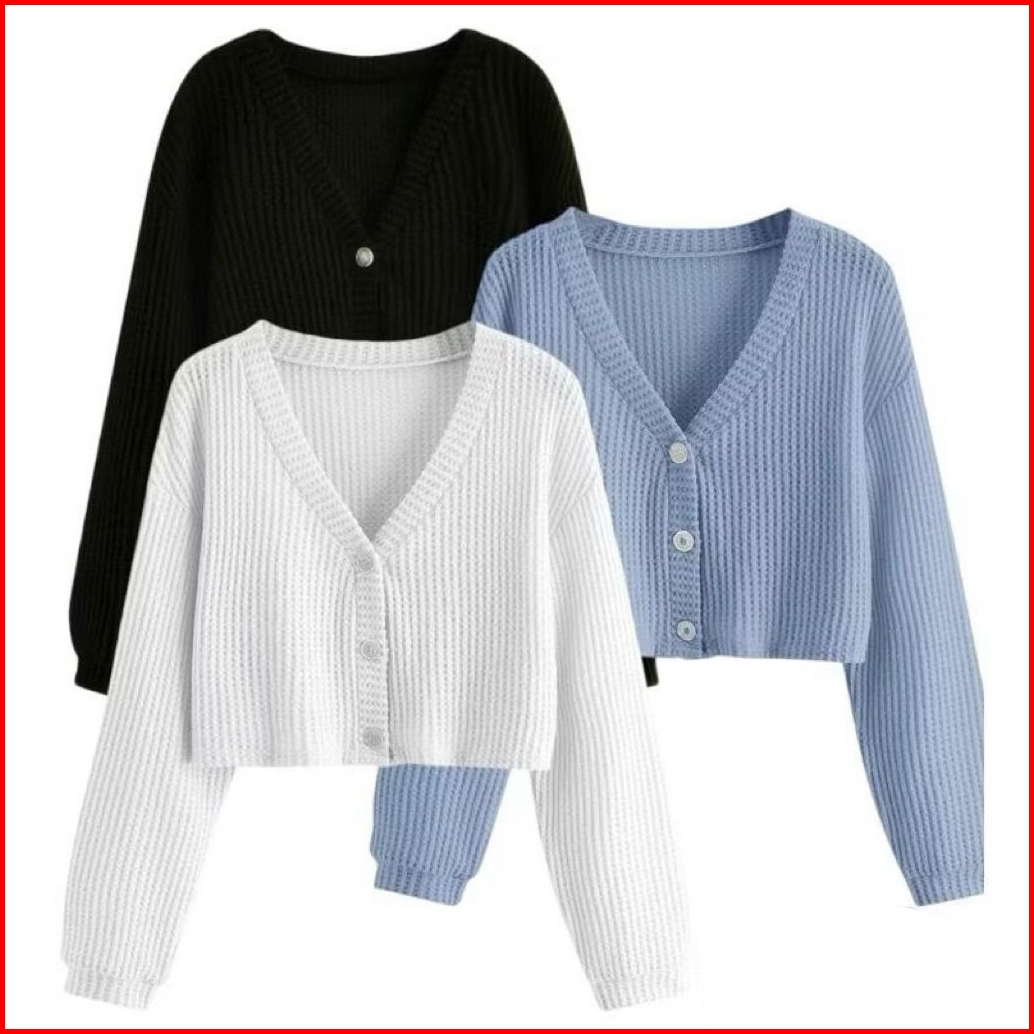 Wefri Store Cardigan Rajut Kancing Crop Top Korean Style Paket 3 Pcs Sweater Waffle Wanita Lengan Panjang