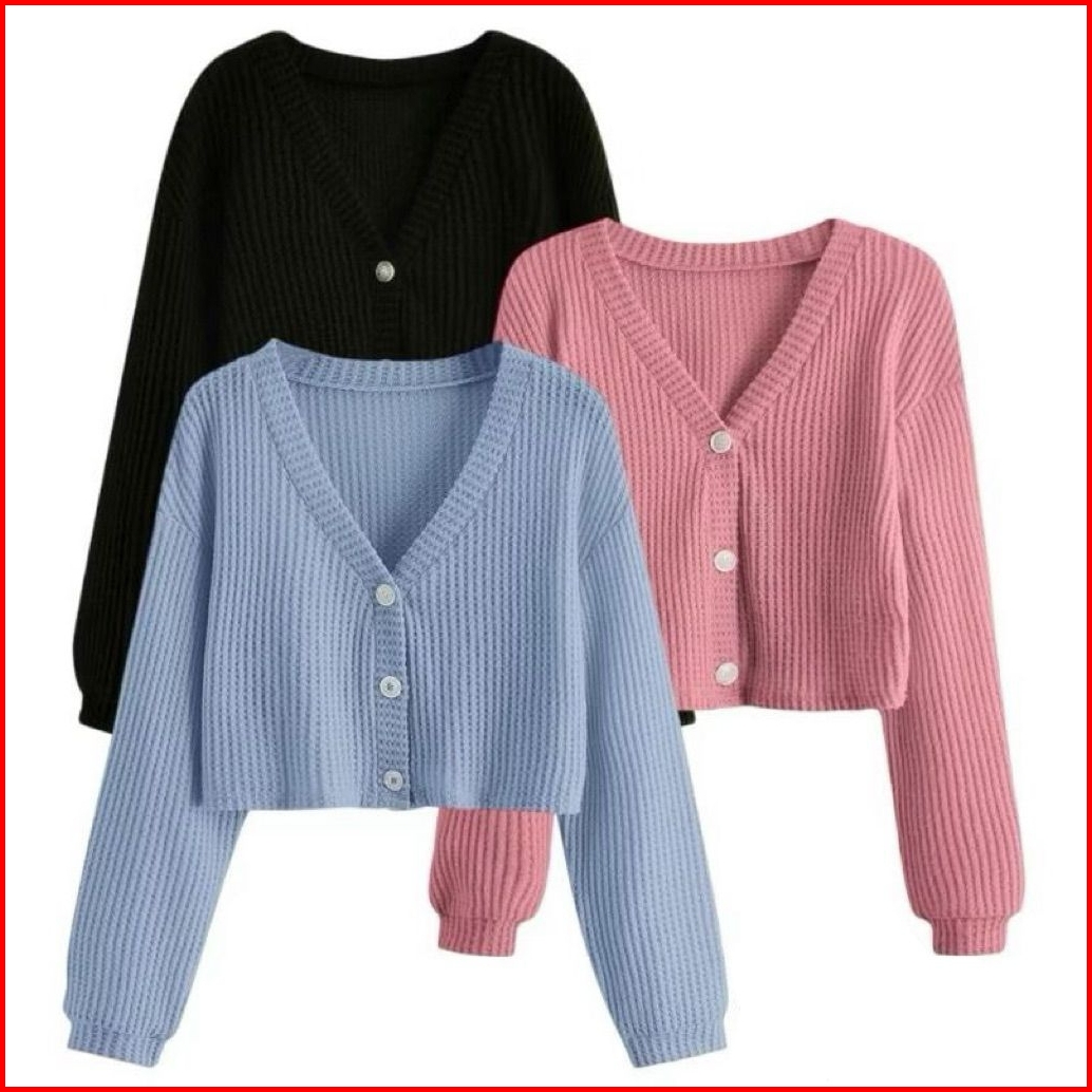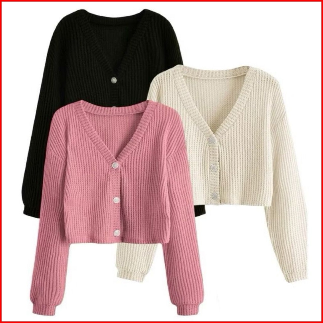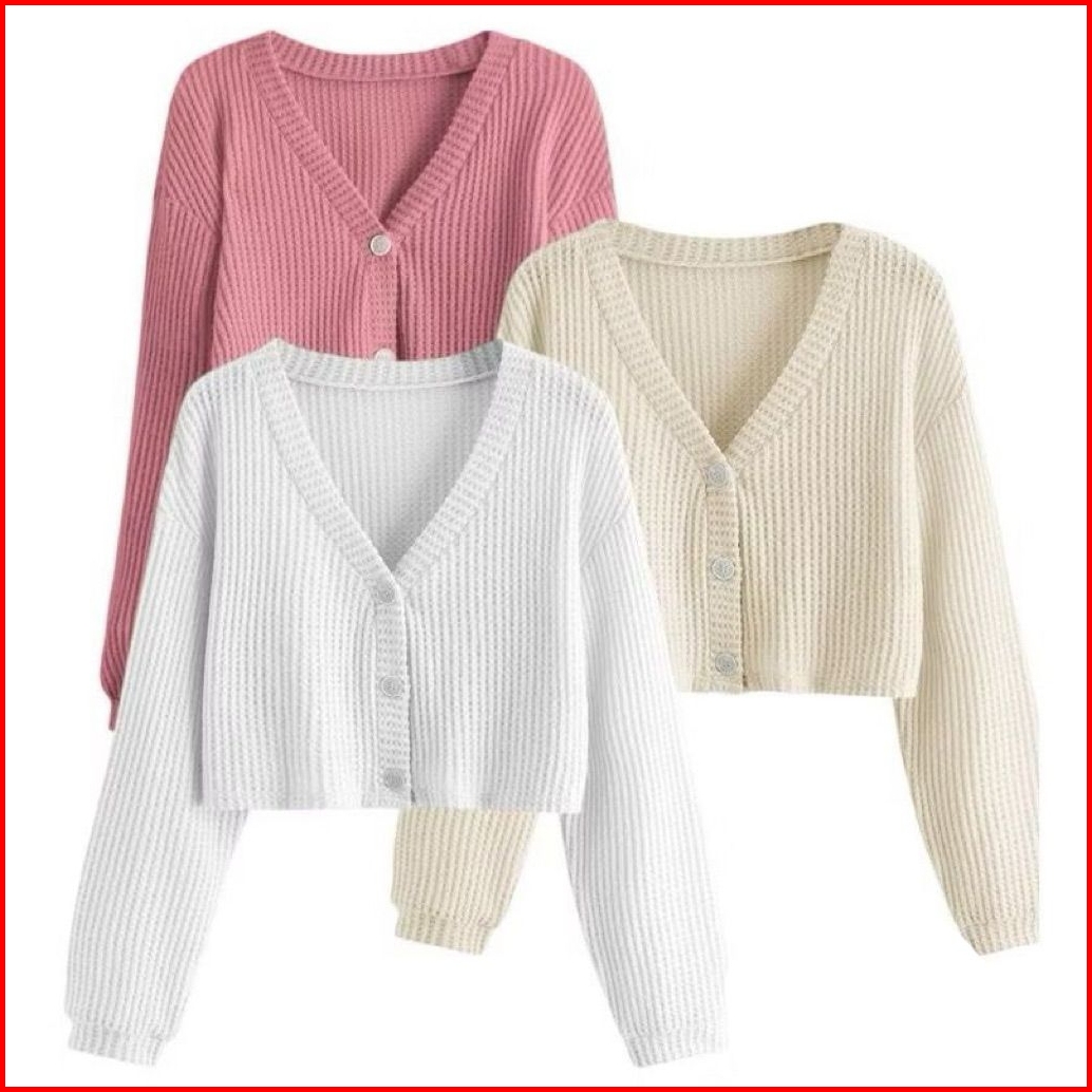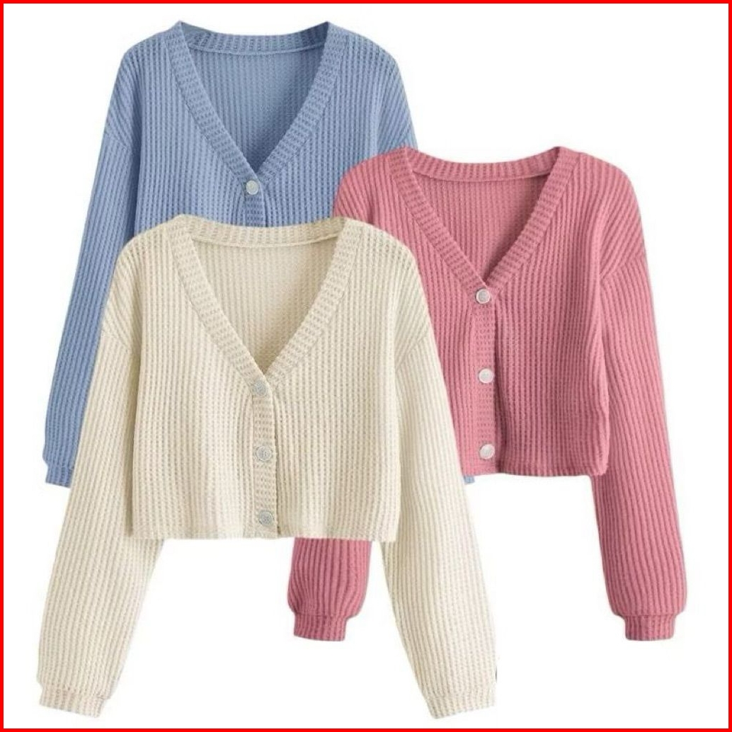 Wefri Store Cardigan Rajut Kancing Crop Top Korean Style Paket 3 Pcs Sweater Waffle Wanita Lengan Panjang