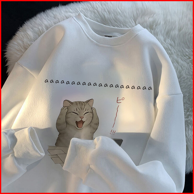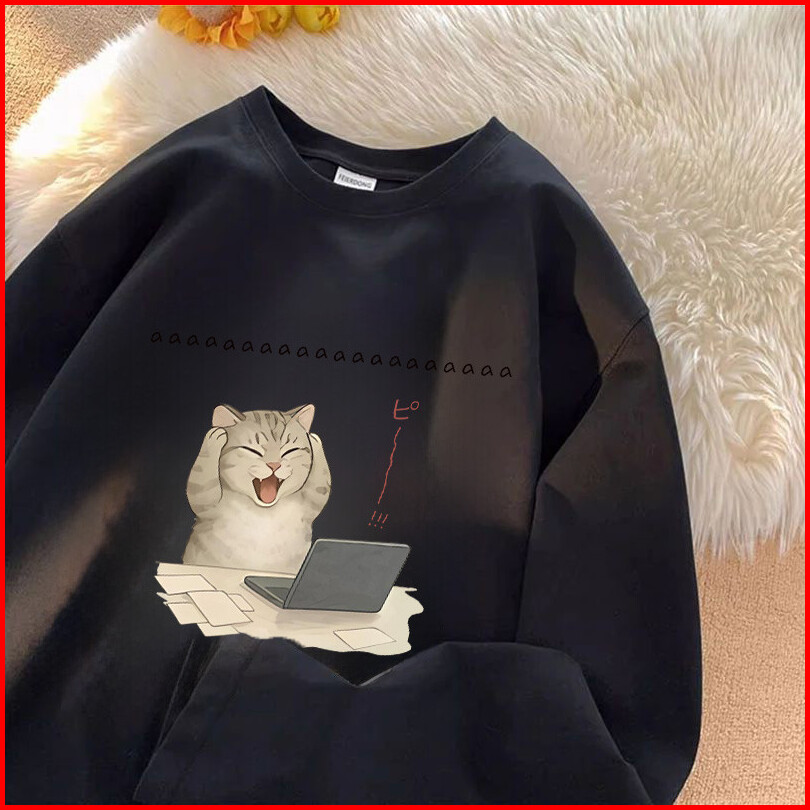 Po Floret Sweater Oversize Baju Cetak Anak Kucing Gila Tshirt Lengan Panjang Retro Style Sweatshirts Katun Murni Wanita