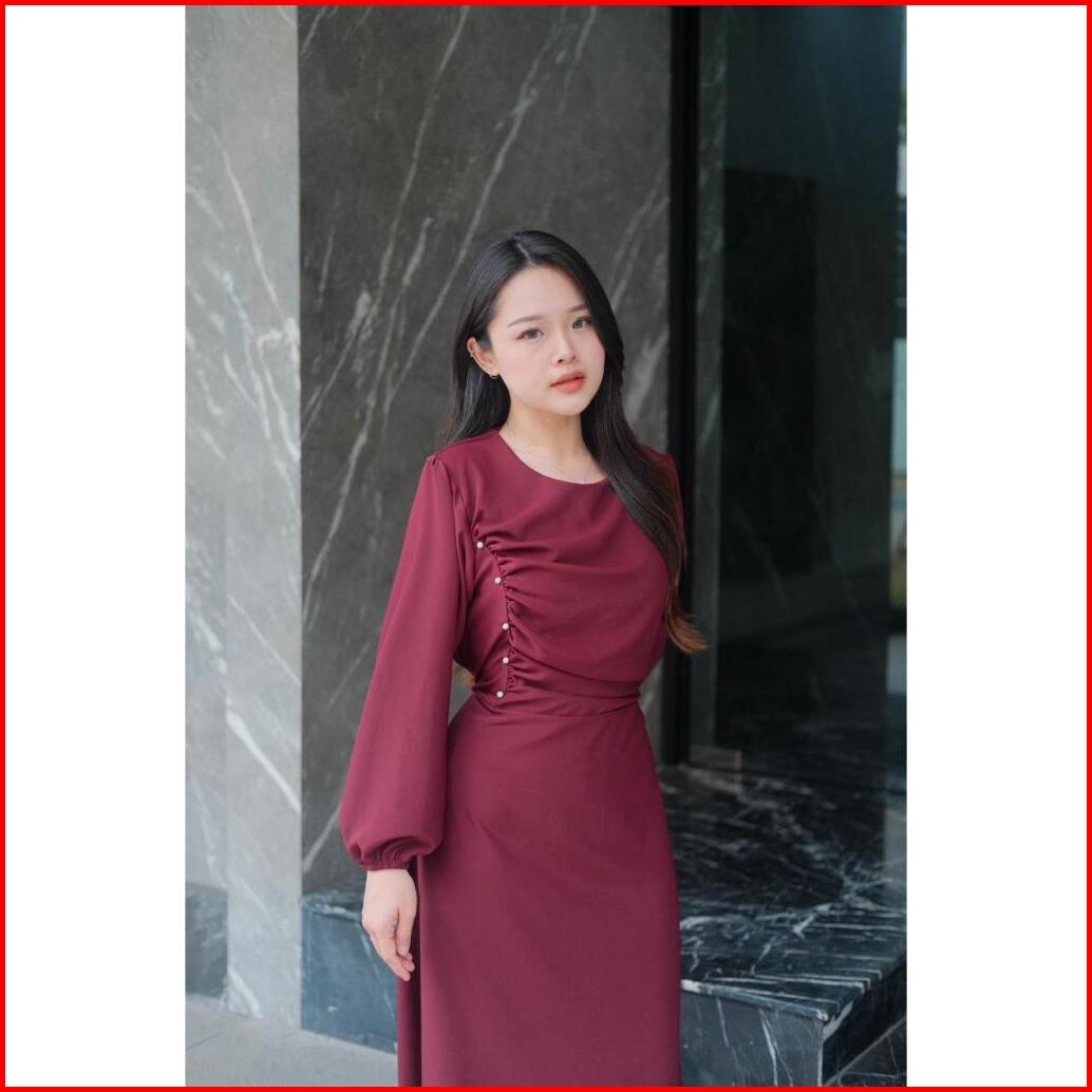 Yeona Dress Cotton Draped Mewah Elegant Dress Lengan Panjang Bertali Casual