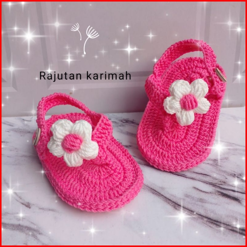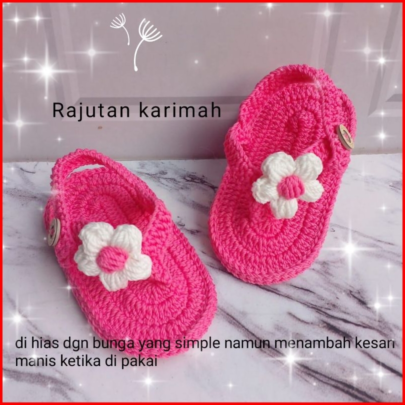 Sendal Bayi Perempuan Rajut Tangan Cantik Lucu Hias Bunga Puff