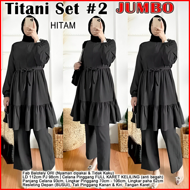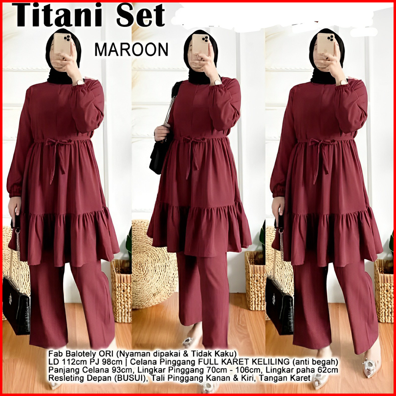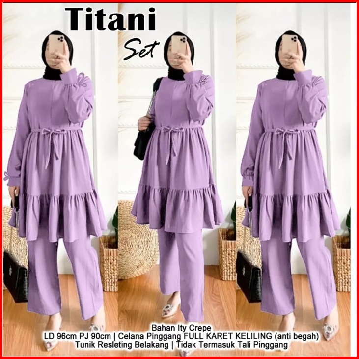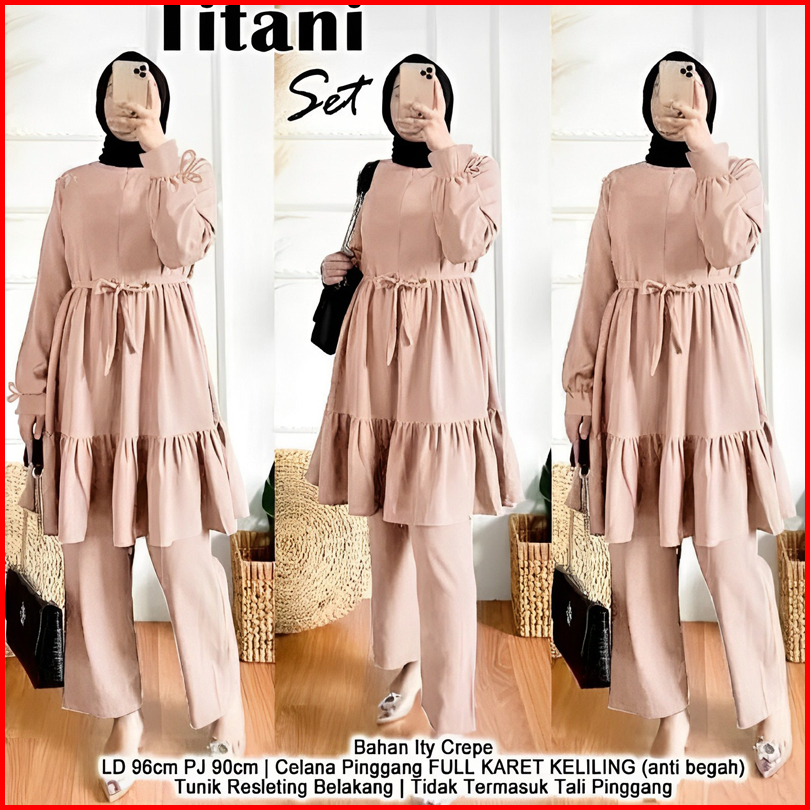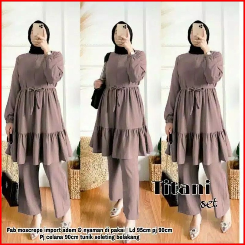 Rmdn - Titani Oneset Setelan Tunik Ruffle Celana Panjang Moscrepe Premium - Setelan Baju Muslim Wanita Modis Terbaru 202