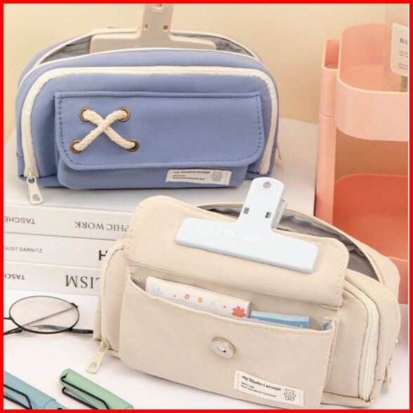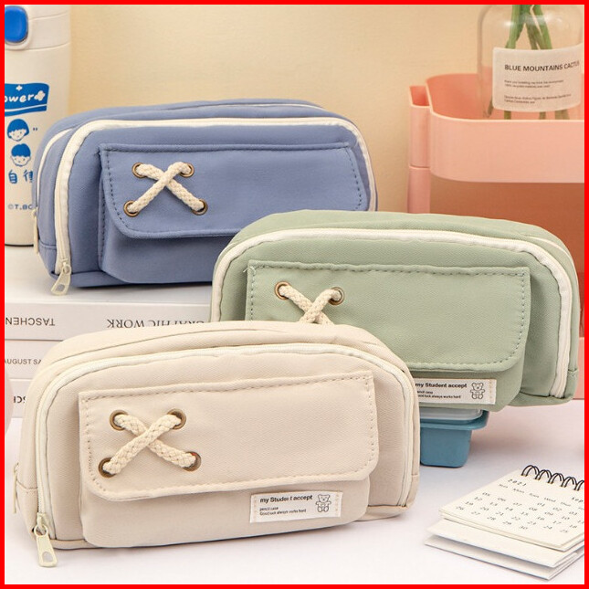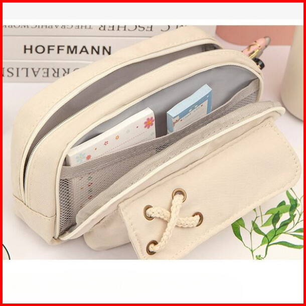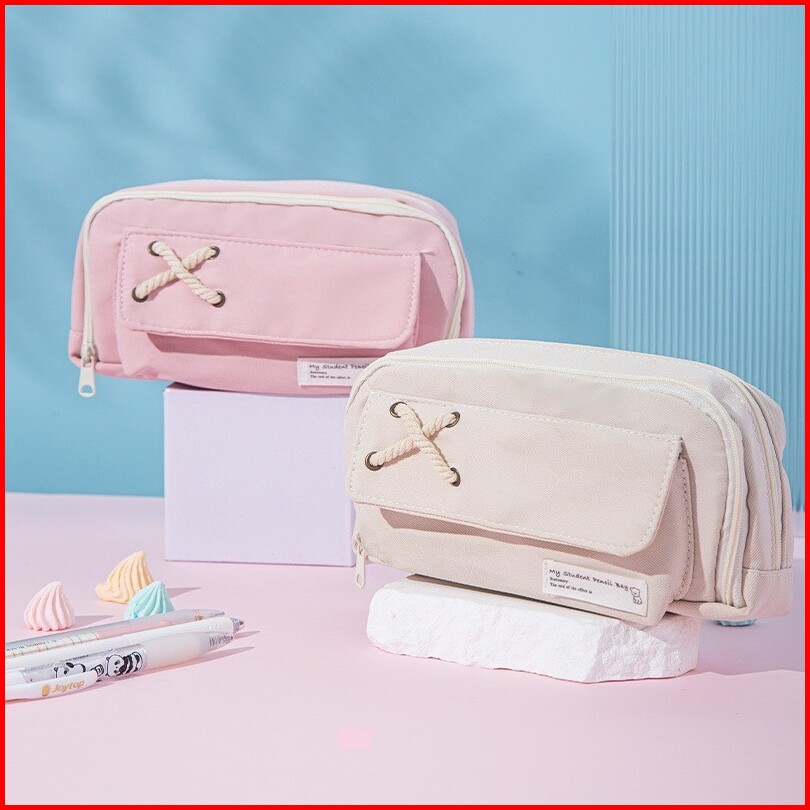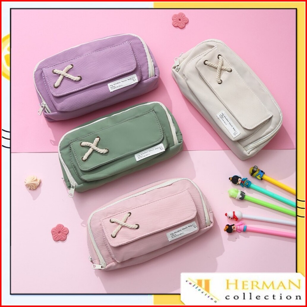 Hc Tempat Pensil Model Pita Silang Kotak Pensil Tali Rami Ritsleting Ganda Bahan Kanvas Pouch Tempat Alat Tulis Perlengk