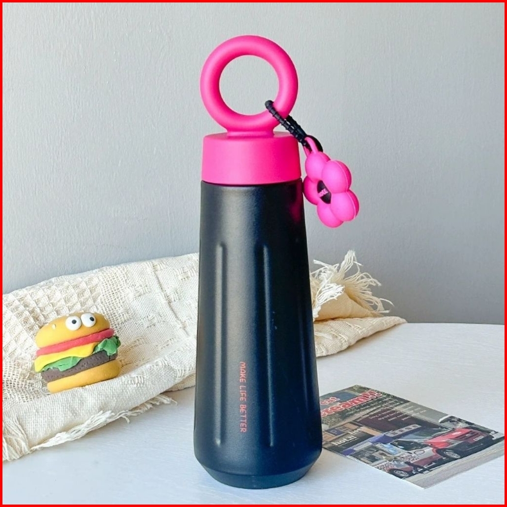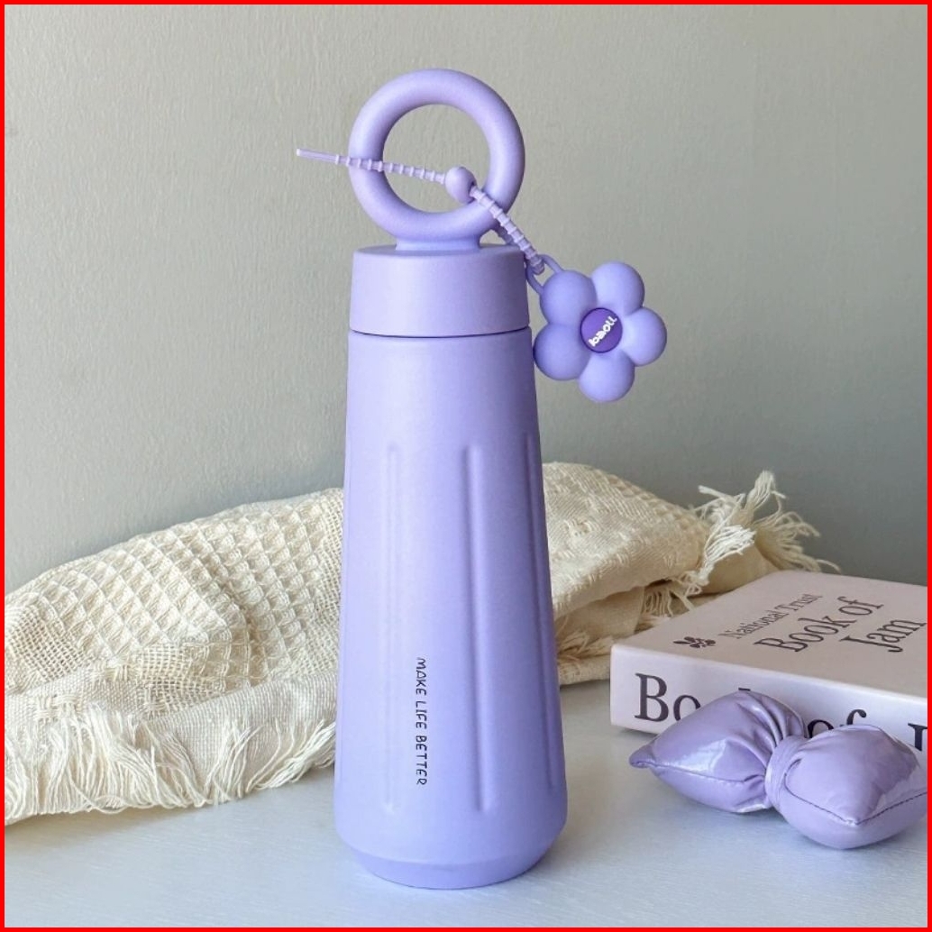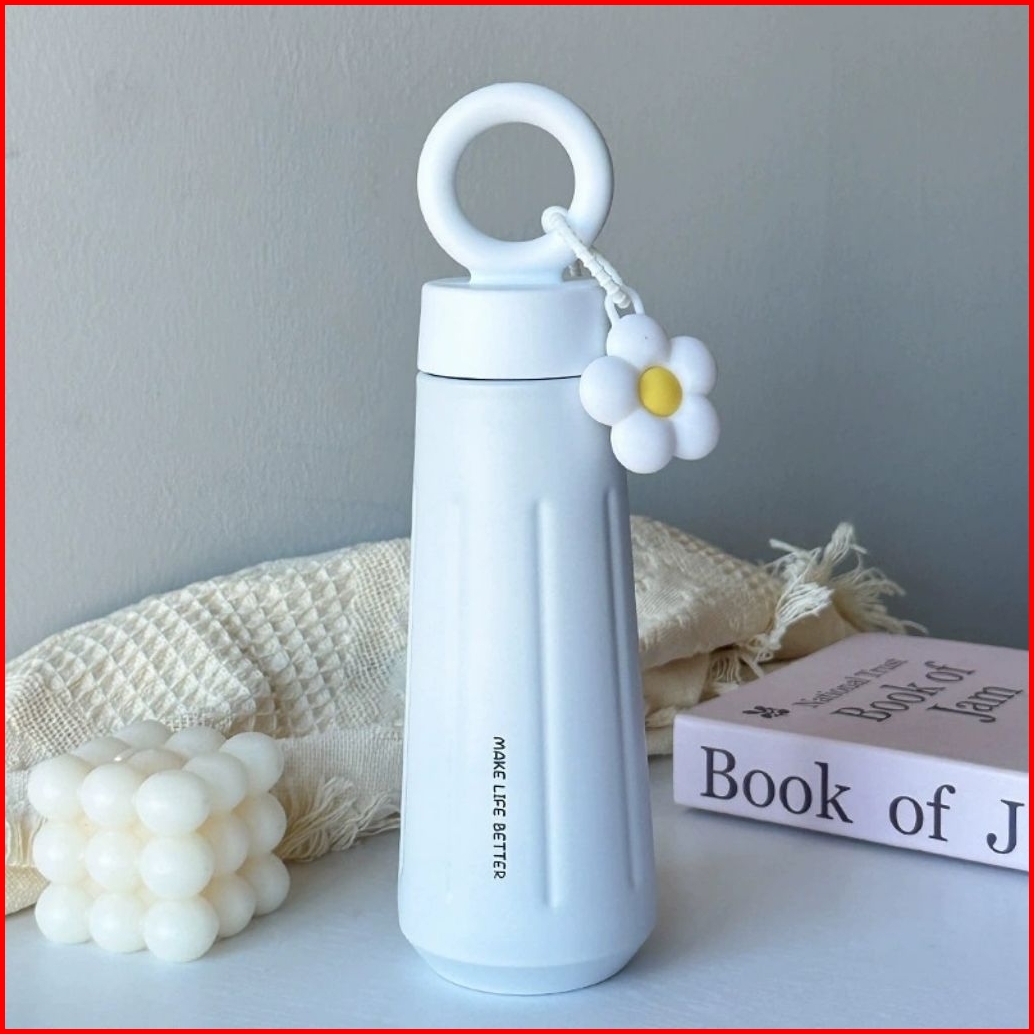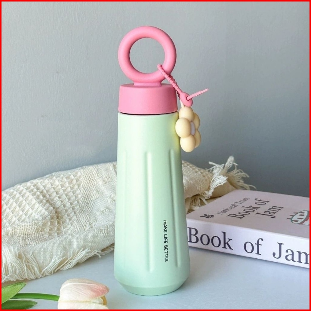 Water Bottle Stainless Steel 450 Ml Botol Minum Tumbler Sus16 Aesthetic With Handle Ring And Flower